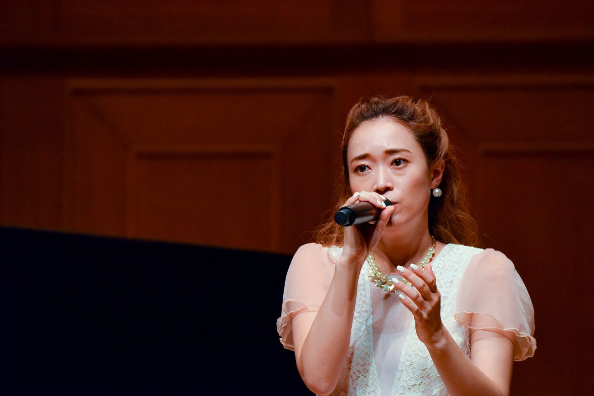 「大阪のみなさんお久しぶりです。昨日から雨がすごく降っていて…無事に皆さんが来られて良かったです。今日はアニメの名曲、そして心の中の思い出の曲もお届けできるかもしれません。最後までよろしくお願いします」との挨拶を挟み、次の曲へ。歌声を聞いていると、少し憂いを含んだ夏の日の情景が目の前に広がっていく。会場に漂う余韻の中、Wakanaの独唱で始まったのは「風のとおり道」だ。『となりのトトロ』の劇中で、トトロが夜に空を飛ぶ印象的なシーンで流れるこの曲。Wakanaのどこまでも伸びていきそうな声とアンサンブルが折り重なって、目の前には幻想的な夜の風景へと切り替わっていく。空間を抱くように丸く奏でられるメロディーの間を、Wakanaの声が吹き抜けていくような感覚だ。ここまでの歌声を聞いてきて痛いほど感じるのは、Wakanaの圧倒的な歌の表現力、そして歌でストーリーテリングをする力。声への力の入れ方や抜き方、ひとつひとつの言葉の発し方や響かせ方で、目の前に物語を出現させてくれる魅力がある。わかりやすく表現するならば、まるでミュージカルを見ているようと言えばお分かりいただけるだろうか。