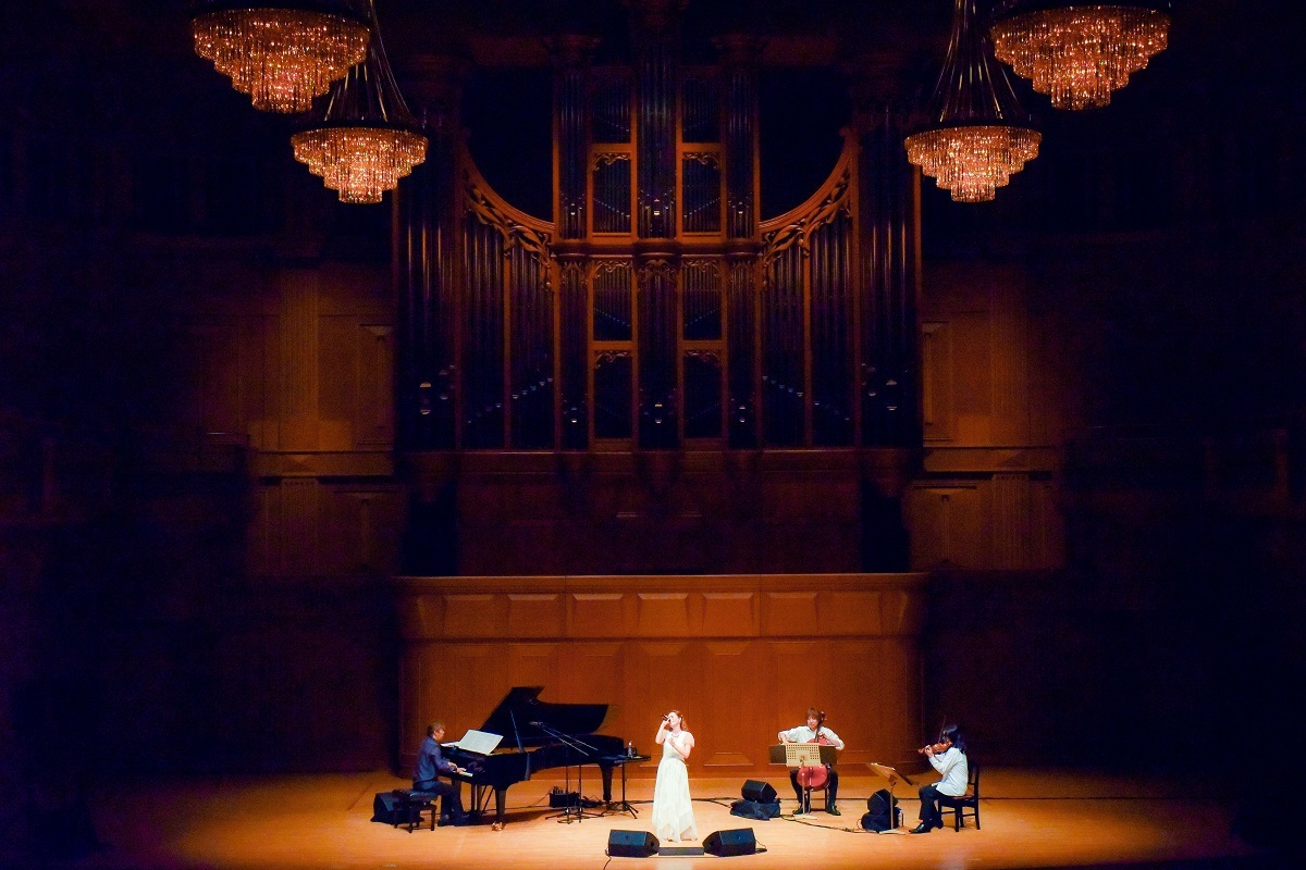 今回の会場である住友生命いずみホールは、舞台奥に鎮座するパイプオルガンやきらびやかな8基のシャンデリアが素晴らしいクラシック音楽に特化したホールだ。なんでも1.8〜2秒というクラシック室内楽にふさわしい残響時間が実現できるようホールの設計も計算され尽くしているという。15時オンタイム、橋本しん(Sin)〈音楽監督・P〉、室屋光一郎〈V〉、結城貴弘〈Ce〉に続いて、純白のロングドレスに身を包んだWakanaが大きな拍手に迎えられて登場した。両手を大きく左右に広げて一礼した後、ライブのオープニングとして『魔女の宅急便』より「やさしさに包まれたなら」、『天空の城 ラピュタ』より「君をのせて」というジブリ映画を代表する人気の2曲を披露。温かで伸びやかな彼女の歌声が高い天井を誇るホールの上から降り注いでくるようで、ライブ開始早々うっとりとしてしまう。