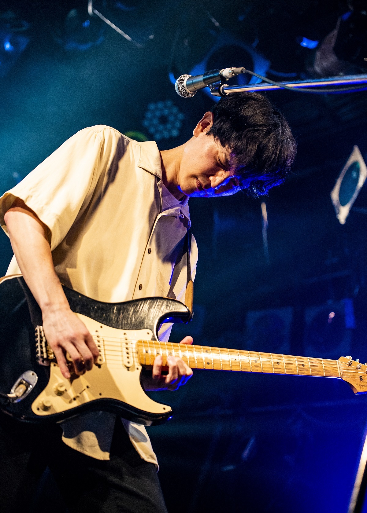 気怠さを感じさせるサウンドはアウトロに入るとスパークし、例えば松原は、ギターのネックを揺らしながらステージ前方に出てきている。ここで上野が「The Songbardsです、よろしく!」と挨拶。さらに「来てくれてありがとう。楽しみましょう!」と「雨に唄えば」に繋げた。岩田が鳴らすビートが曲間を繋ぐなか、上野が「猿の鳴き声が聞こえる少し変わった曲ですが、みなさん楽しんでいただければと思います」と紹介したのは、「Monkey Mind Game」。“そろりそろり”と形容したくなるギター&ベースによるユニゾンのフレーズのあと、リフやワウギターとともに進む1曲で、メンバー同士アイコンタクトをとりながら楽しげに鳴らす姿が印象的だ。長いアウトロを終えると、リズムを刻むバンドサウンドがクレッシェンドしていき、やがて「悪魔のささやき」に辿り着く。