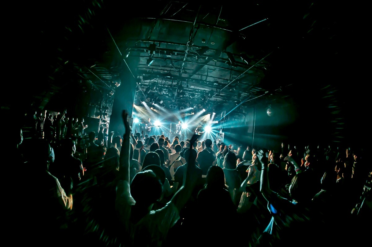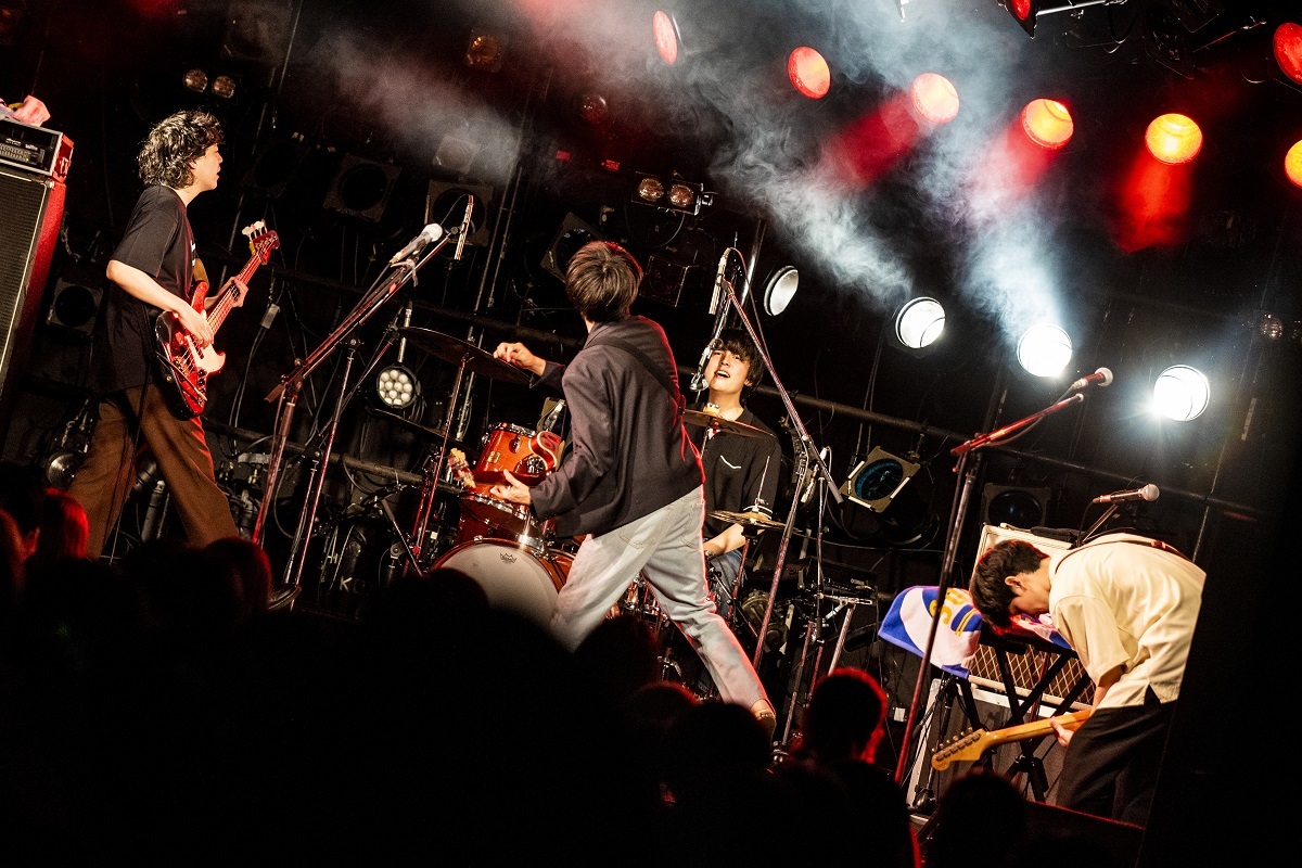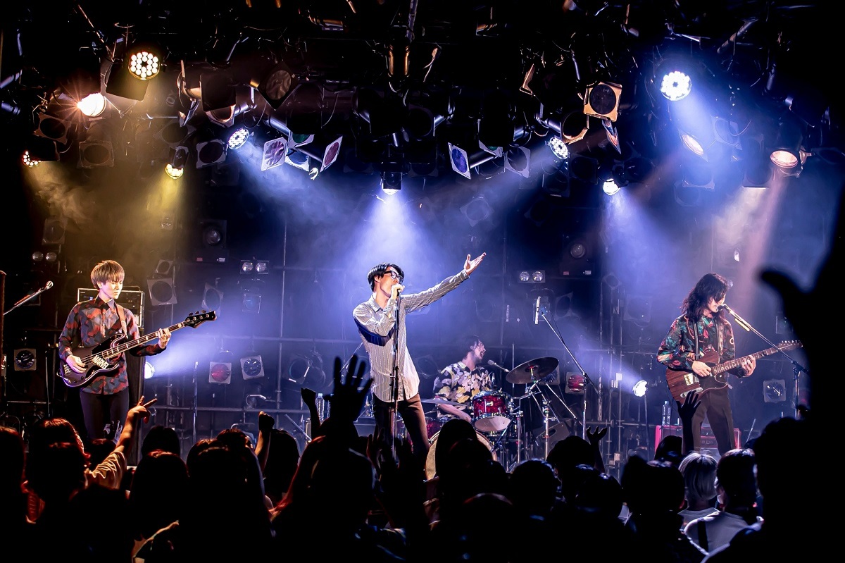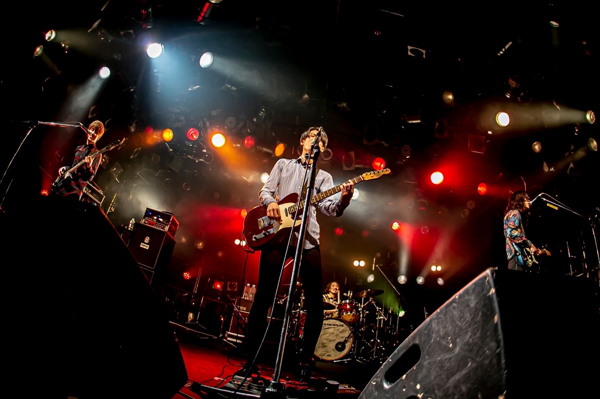 さて、今回のツアーは『AUGURIES』のリリースに伴うものであり、『AUGURIES』はSEをふんだんに盛り込んだアルバムだった。上野皓平(Vo/Gt)、松原有志(Gt/Vo)、柴田淳史(Ba/Cho)、岩田栄秀(Dr/Cho)がスタンバイする間に流れていた靴音のSEは、まさに『AUGURIES』の冒頭を彷彿させるもの。おそらくアルバムを聴き込んでいた人ならば“おっ!”と思ったことだろう。しかしこの日最初に演奏されたのはアルバム1曲目の「ビー・ヒア・ナウ」ではなく、「Engineered Karma」。意表をつかれたが、イントロの音声をライブの始まりを告げるアナウンスに変える演出にはワクワクさせられたし、2分以内のショートチューンを頭に持ってくるのは、夜ダンファンへの自己紹介としてはスマートだ。