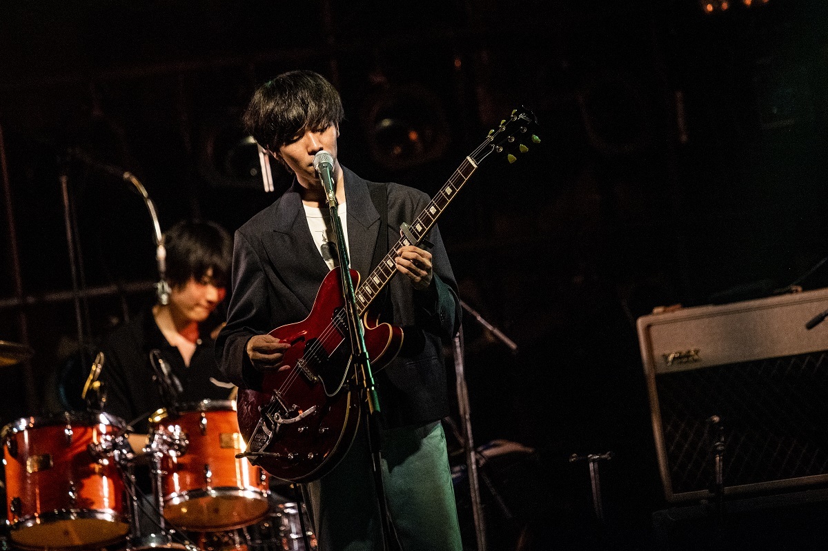 最初の4曲を終えるとMCへ。ここでは上野が、観客や夜ダンへの感謝や無事ライブを開催できた喜びを言葉にしつつ、夜ダンメンバーから「ごめん、お前ら飛行機ちゃうのに飛行機みたいに言うてもうて」と謝られたことを明かした。新曲初披露の貴重なシーンはまだ続き、このMC中には松原の前にキーボードが登場。そして「夕景」が演奏された。MCでも語られたように、「夕景」は、山陽電車から見える景色が基になっている曲。電車の発車音のSE、夕焼け色の照明、3声のハーモニーによる歌い出し……ノスタルジックなサウンドが、彼らの地元・神戸の風景をイメージさせてくれた。また、そのあとに続くのが「窓に射す光のように」という堪らない展開。歌心に満ちた2曲で聴き手を包み込むこのパートは、今回のセットリストにおけるハイライトと言えそう。今後の2公演を経て、歌や演奏の深みがもっと増していけば、さらに良くなっていきそうな予感がした。