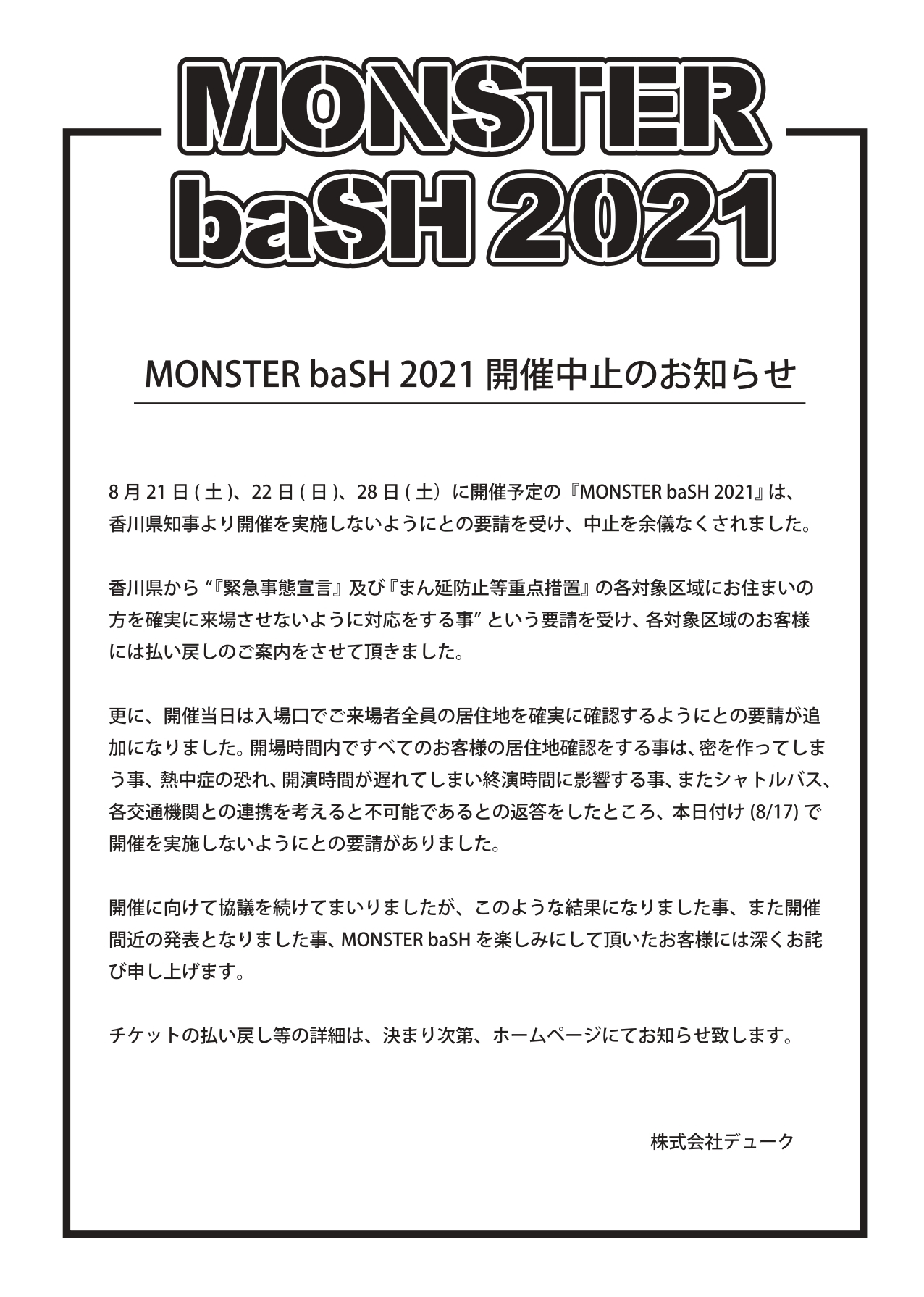 8月21日(土)、22日(日)、28日(土)の3日間、香川県・国営讃岐まんのう公園にて開催を予定していた野外フェス『MONSTER baSH 2021』が中止することを発表した。