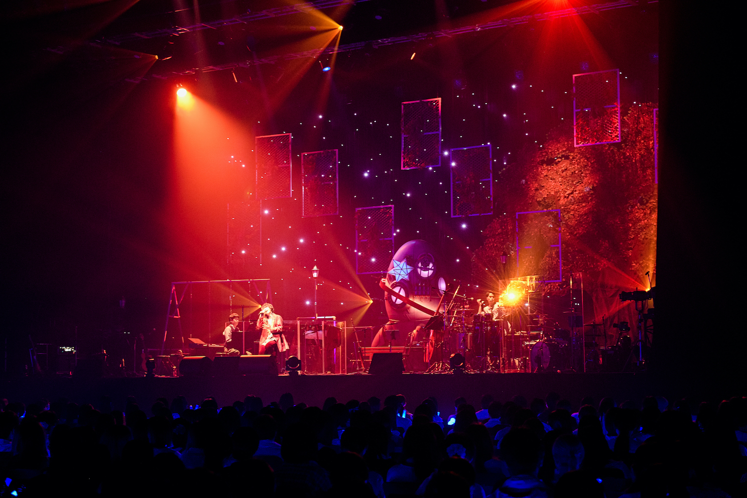 オープニングナンバーは「ユーリカ」。ギター、ベース、ドラム、生ピアノとパーカッションが彩る贅沢なサウンドに、そらるの伸びやかな美声がよく映える。「今日1日、よろしくお願いします!」と、目の前にいる観客に呼びかけたそらる。どの席からもステージが見やすい立体的な4層構造の客席は、ステージからもよく見渡せるのだろう。