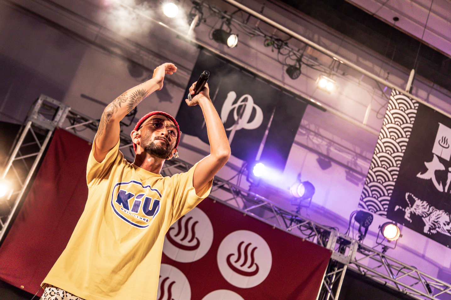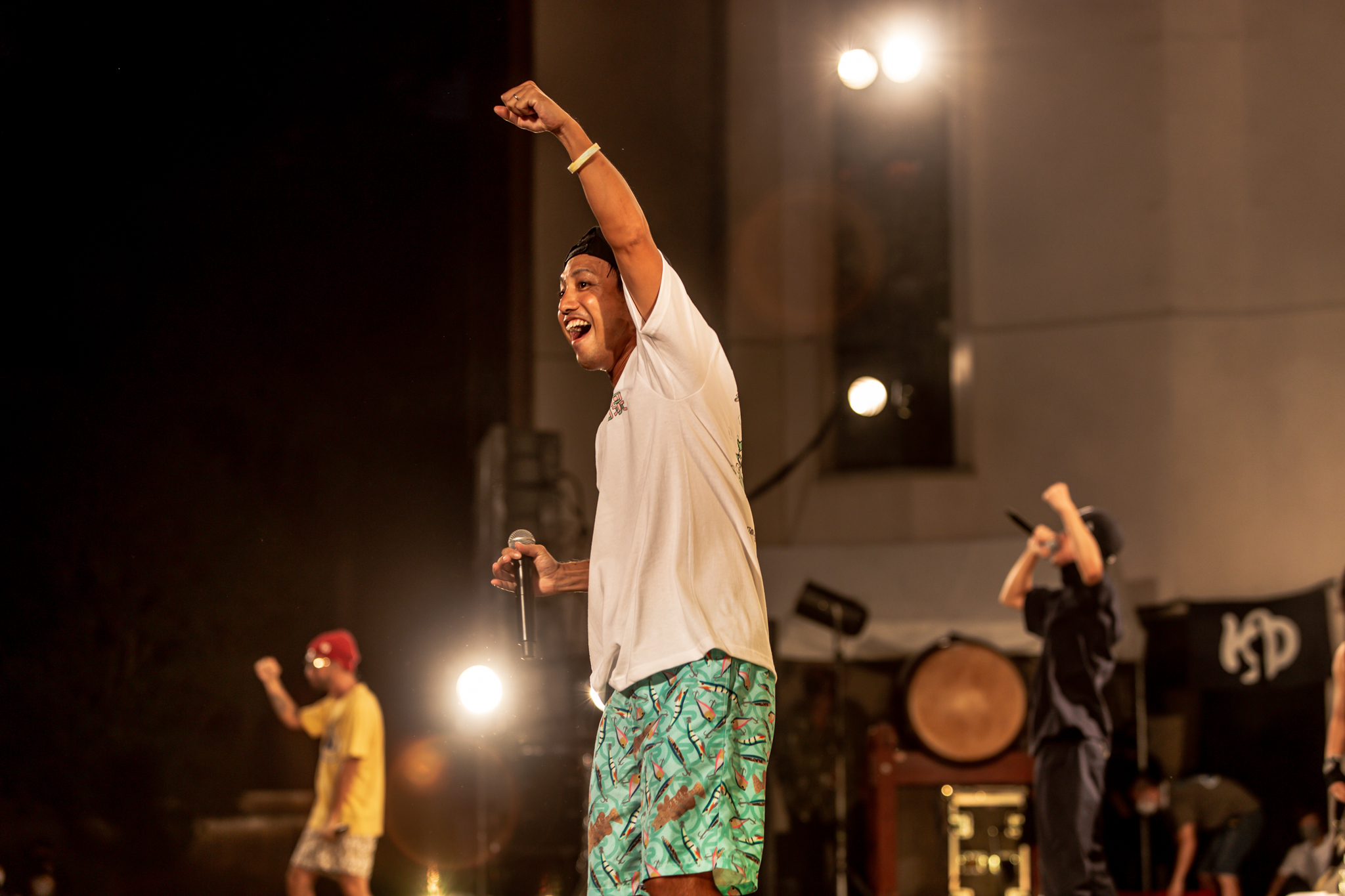 続いてMONGOL800のサポートギタリスト・Kubotyを呼び込む。「ここに至るまでにあったやりとりはLINE2通ぐらい!」(Kuboty)という阿吽の呼吸で決まったセッションは、続く「チェスト」で炸裂! NAOTO(Gt)のソリッドなプレイとKuboty のラウドなツインギターをバックに、MCの3人もステージ中を駆け回り応戦していく。そのテンションを引き継ぎ、イントロから会場の空気がブチ上がった「イケナイ太陽」を投下。YAMATOが歌うと見せかけ水を飲むフェイントをかけるなどショーマンシップも織り込み、ラストは「キリキリマイ」を! サポート・ドラマーの哲之(Dr)が腹の底まで響く破裂音で導き、ポップかつタフな表情で宴を締めくくってくれた。