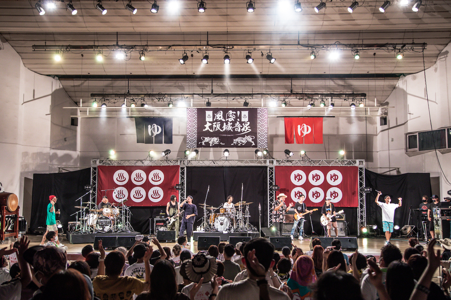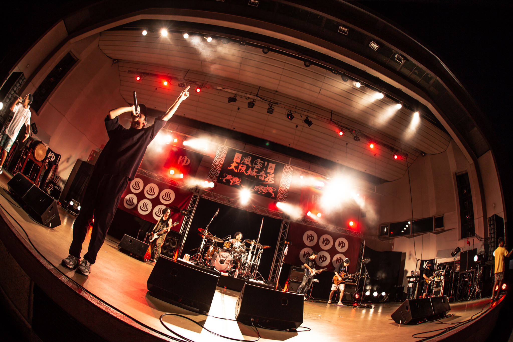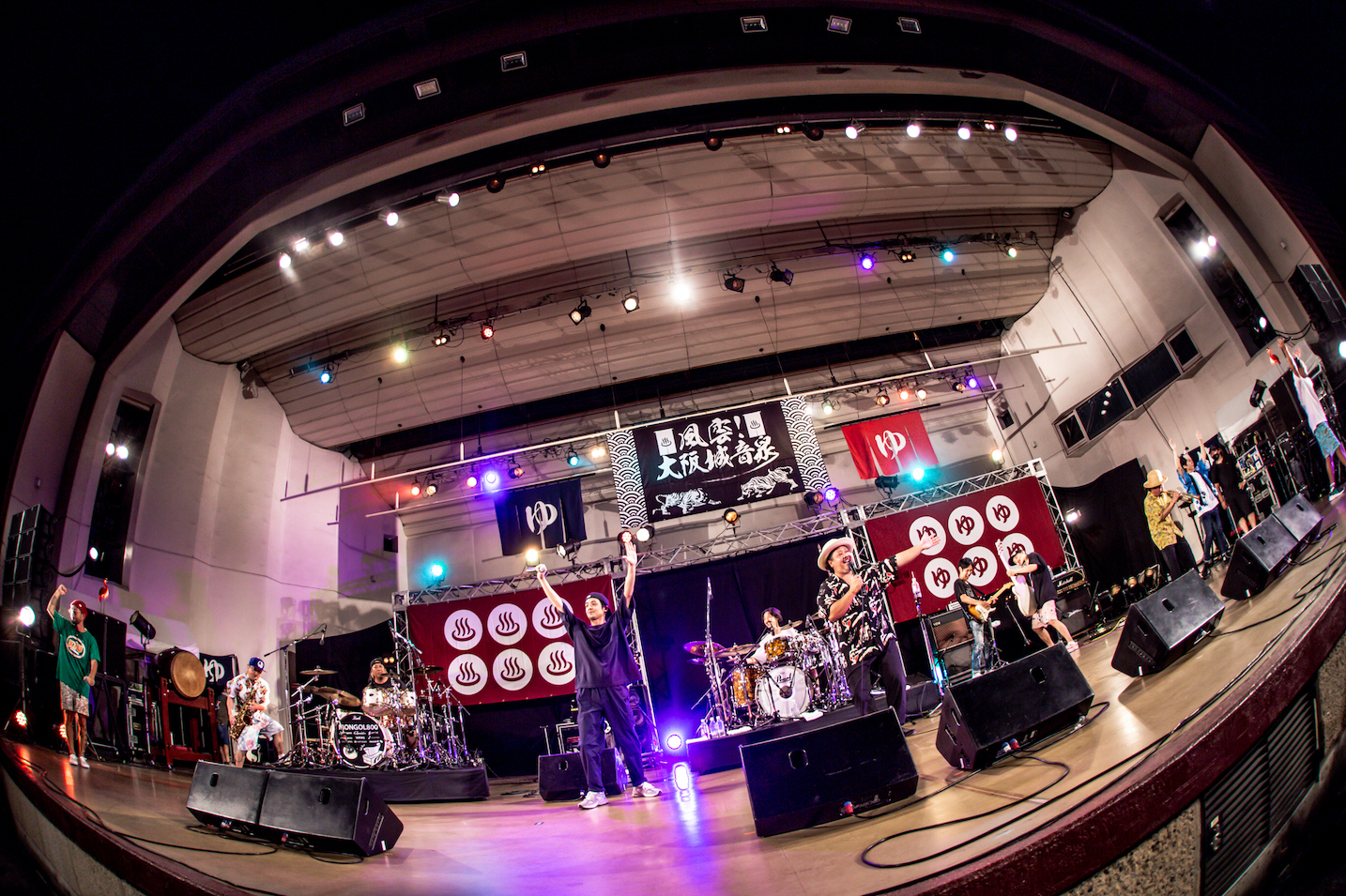 イベントは、清水音泉の「男湯」こと田口氏の前説からスタート。「『大阪城音泉』第1回目に、ORANGE RANGEが出てくれたんですよね。今日の対バン(ツーマン)は実に5年ぶりです。沖縄の2組ですが、(今流れている)BGMはハワイアンでちょっと選曲は失敗かも? でもライブは失敗しませんよ」と、頼もしい言葉も飛び出しながら、ここで翌日に出番を控えるキュウソネコカミのヤマサキセイヤ(Vo.Gt)が絶叫しつつ登場! 前日夜という突然のオファーだったにも関わらず、開幕の和太鼓を鳴らし、壱番風呂のMONGOL800を呼び込む。
