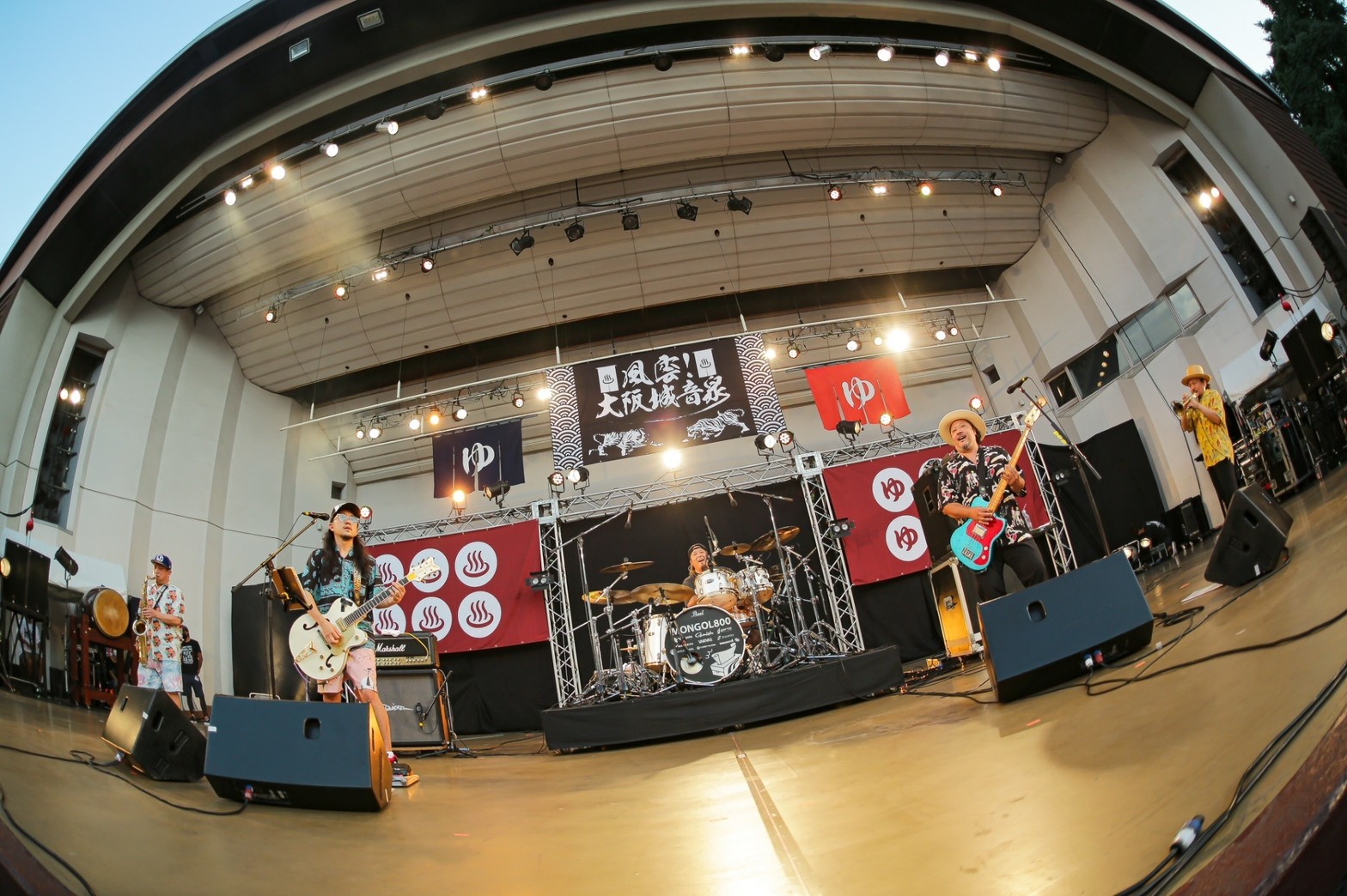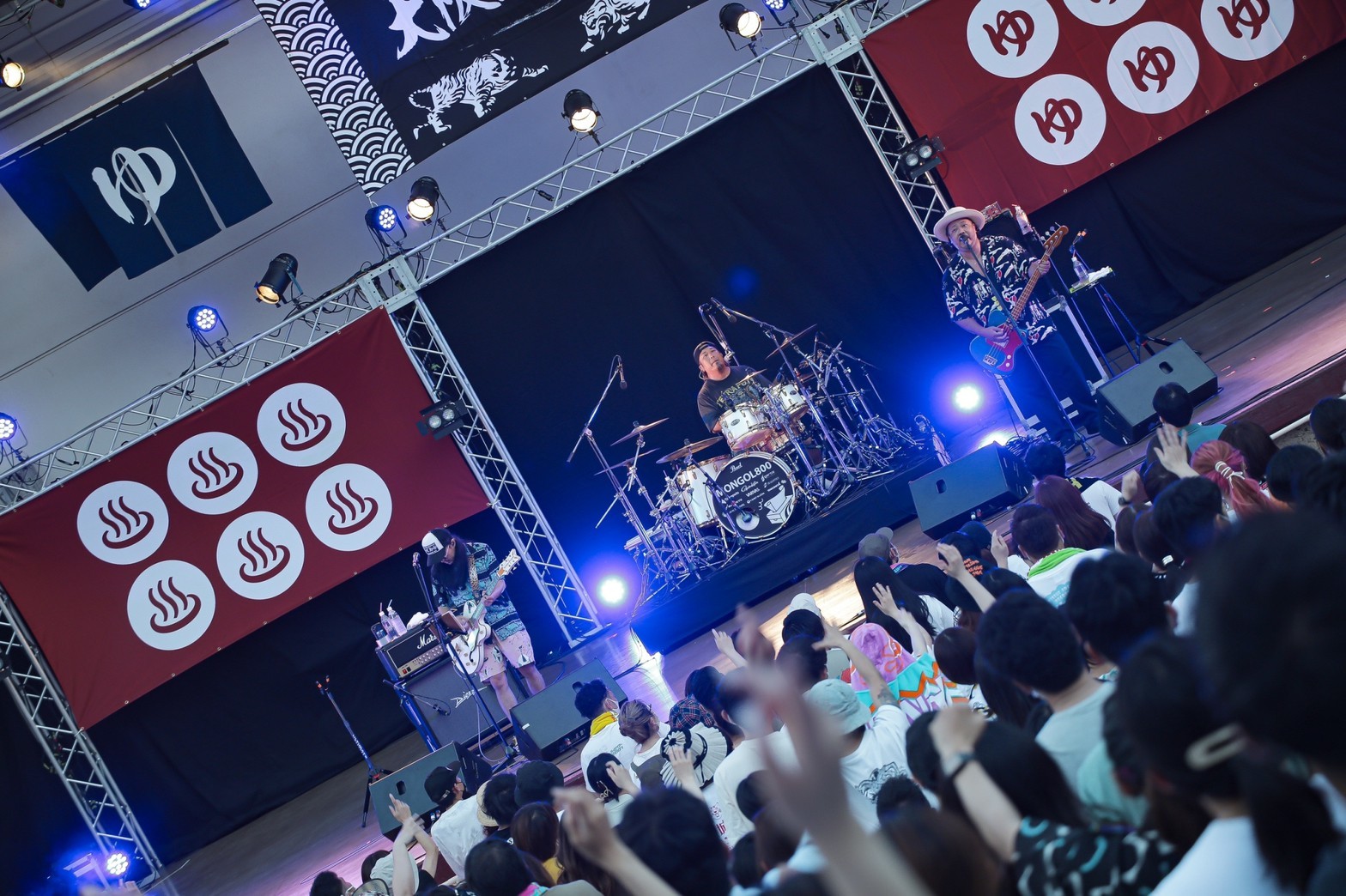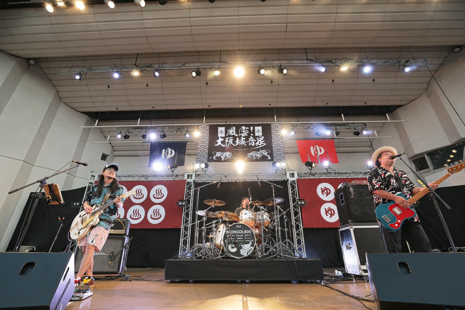 イベントは、清水音泉の「男湯」こと田口氏の前説からスタート。「『大阪城音泉』第1回目に、ORANGE RANGEが出てくれたんですよね。今日の対バン(ツーマン)は実に5年ぶりです。沖縄の2組ですが、(今流れている)BGMはハワイアンでちょっと選曲は失敗かも? でもライブは失敗しませんよ」と、頼もしい言葉も飛び出しながら、ここで翌日に出番を控えるキュウソネコカミのヤマサキセイヤ(Vo.Gt)が絶叫しつつ登場! 前日夜という突然のオファーだったにも関わらず、開幕の和太鼓を鳴らし、壱番風呂のMONGOL800を呼び込む。
