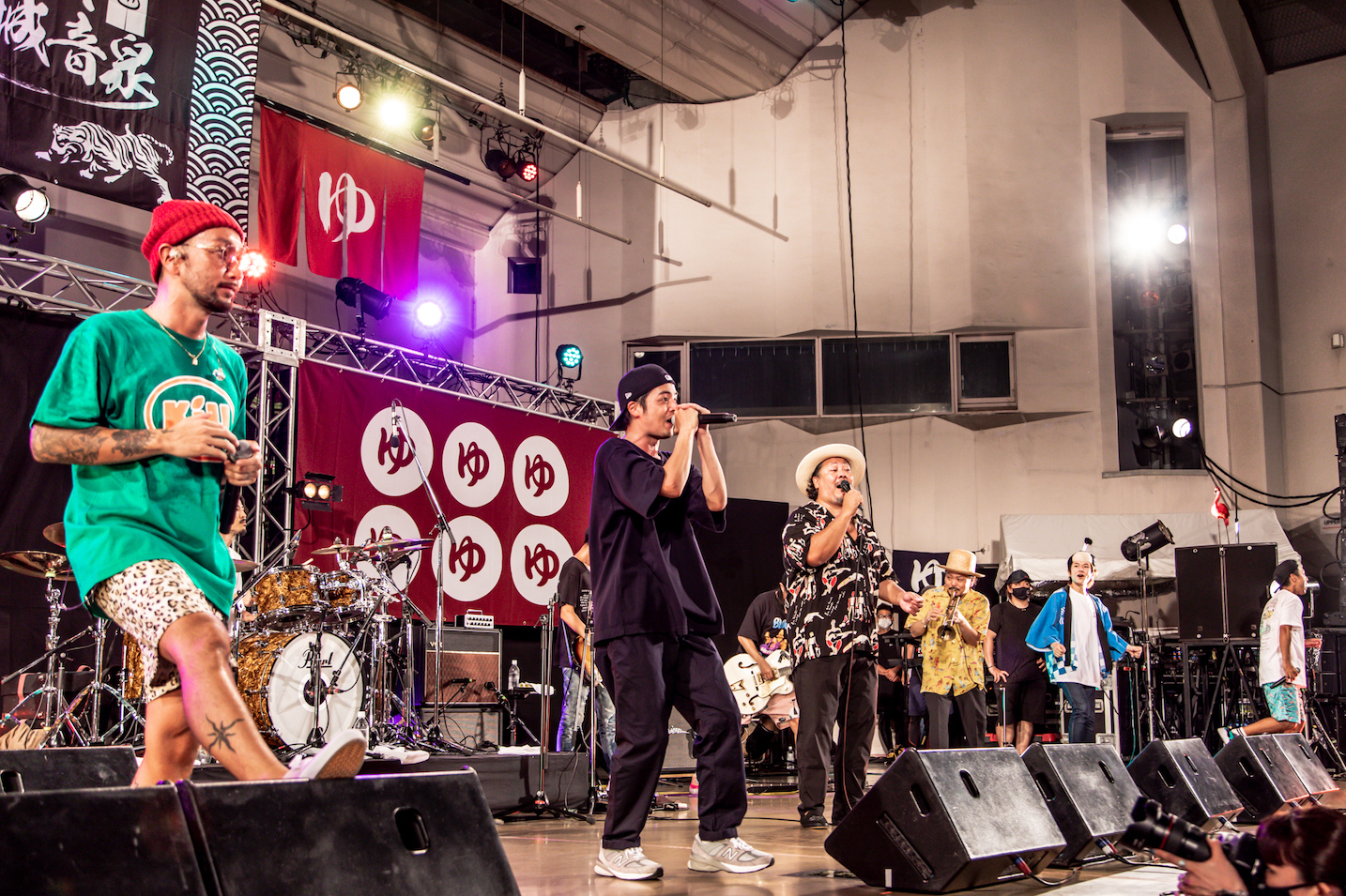 「まいど! めっちゃいい天気過ぎますね、大阪。(暑さに慣れているはずの)沖縄のバンド2組が楽屋でぐったり。みんなにも見せたいです(笑)」(キヨサク)との言葉にも納得の天候に恵まれたこの日。お次はDOBERMANのSeasir(Tp)とSCAFULL KINGのNARI(Sax)を呼び込み、サンボマスターの「青春狂騒曲」を南国テイストたっぷりにカバーしていく。続く「PARTY」では、Kubotyの鮮烈なギターソロと圧巻のホーンセクションとが絡み合い、会場の熱気はさらなる高みへと上昇! 1曲奏でるごとにピークを超え続け、バンドが持つ地力を改めて示してくれる。