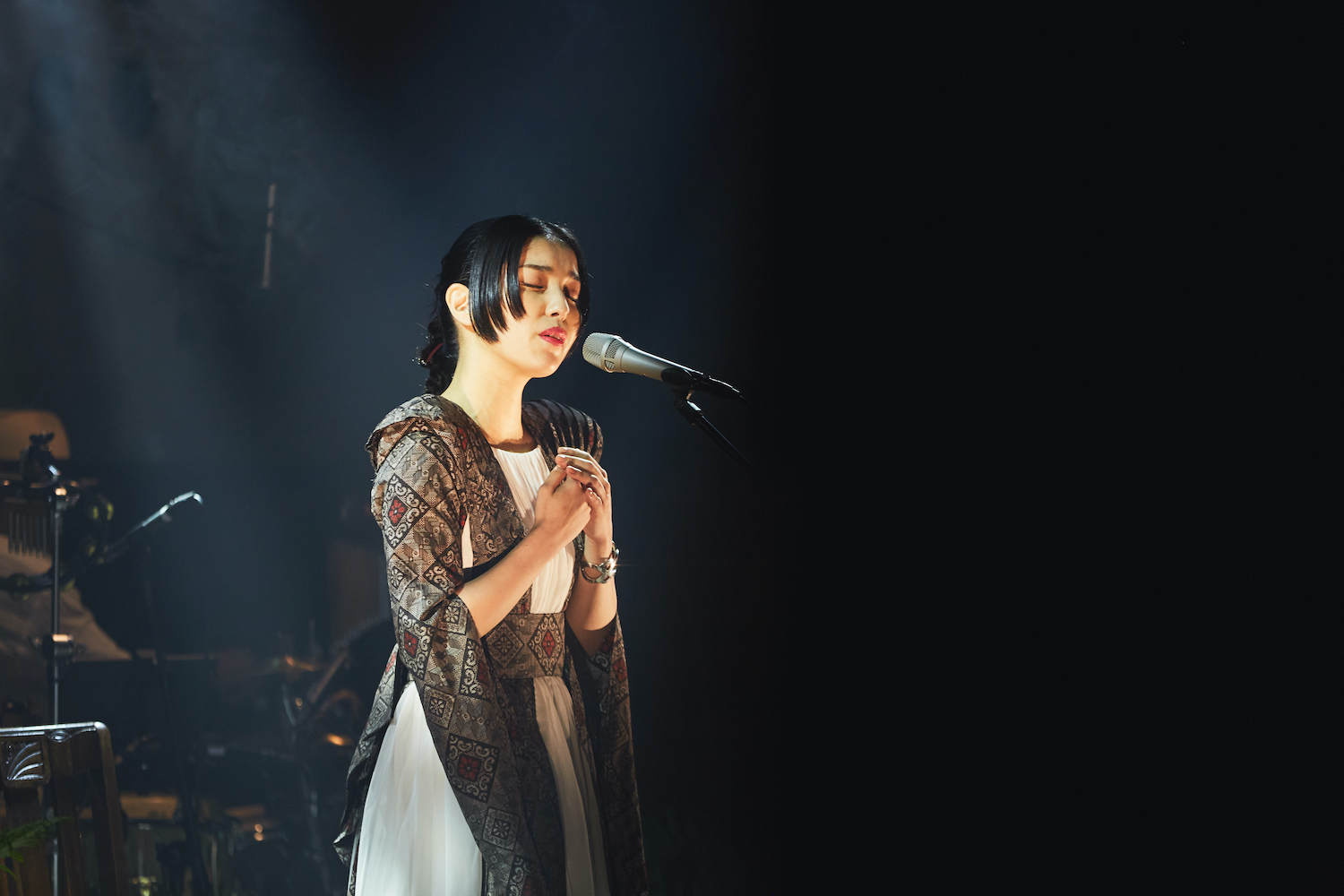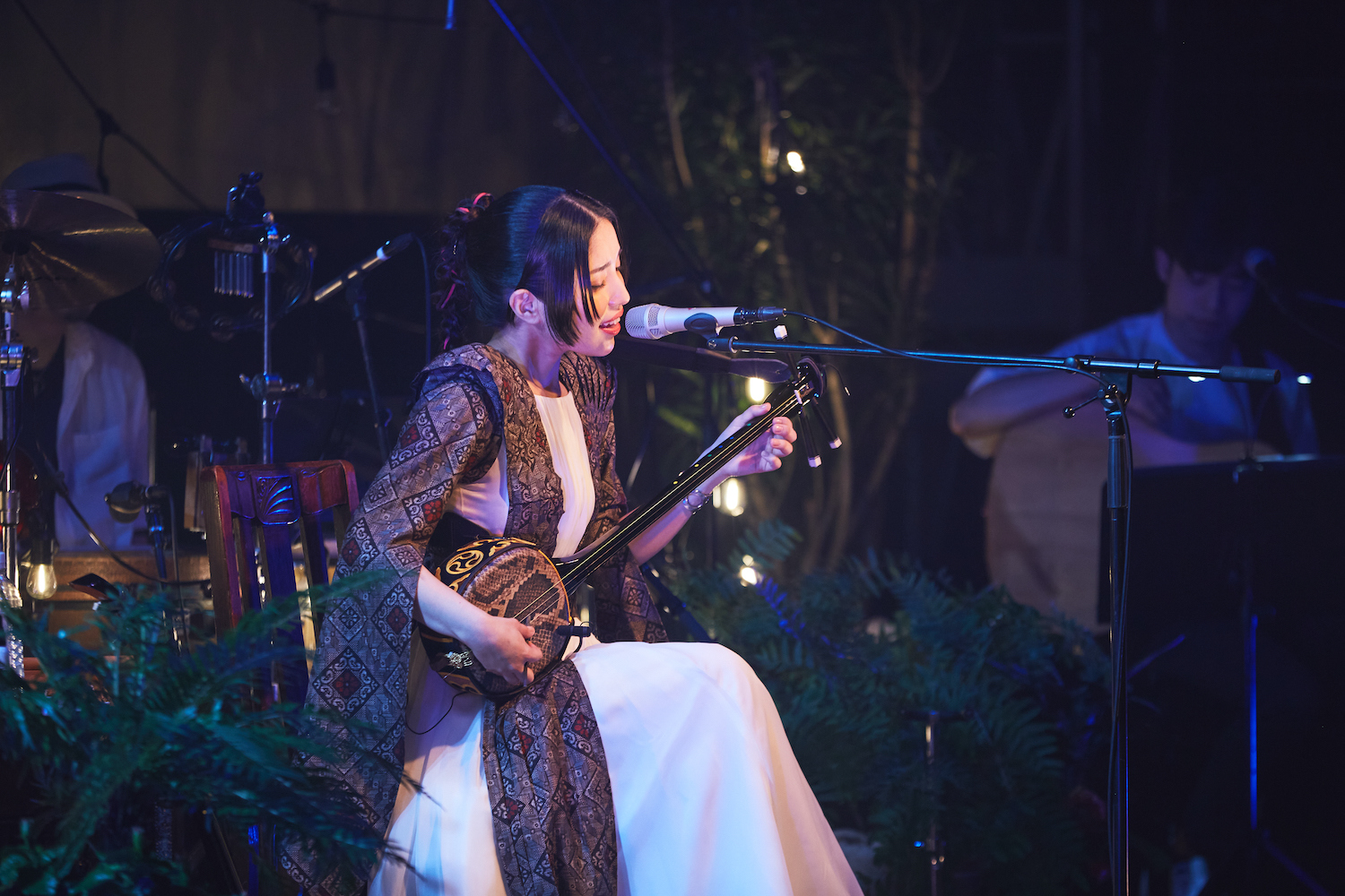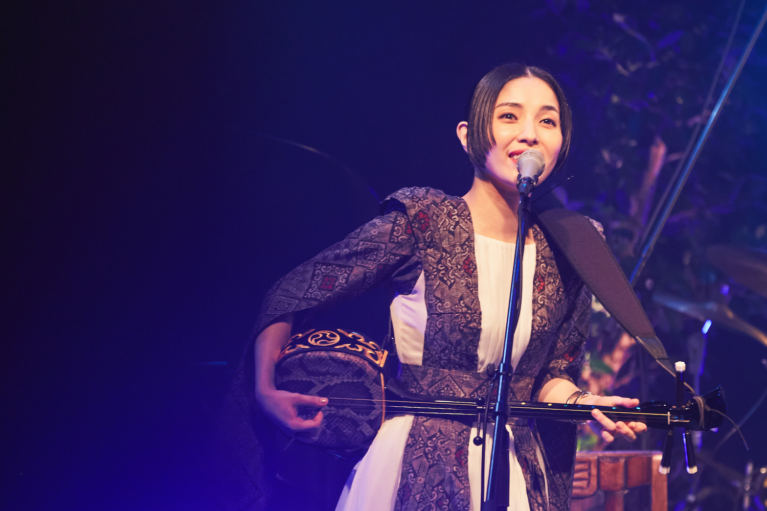 「最後にもう1曲、シマの言葉で歌いたいと思います」と前置きしたのは、初の自作詞曲である「祈りうた」。喜びも哀しみも歌にして残してきた奄美のシマ言葉をちりばめた歌と、奄美三味線の奏で。それは、シマの心を持ち続ける彼女のアイデンティティそのものだ。