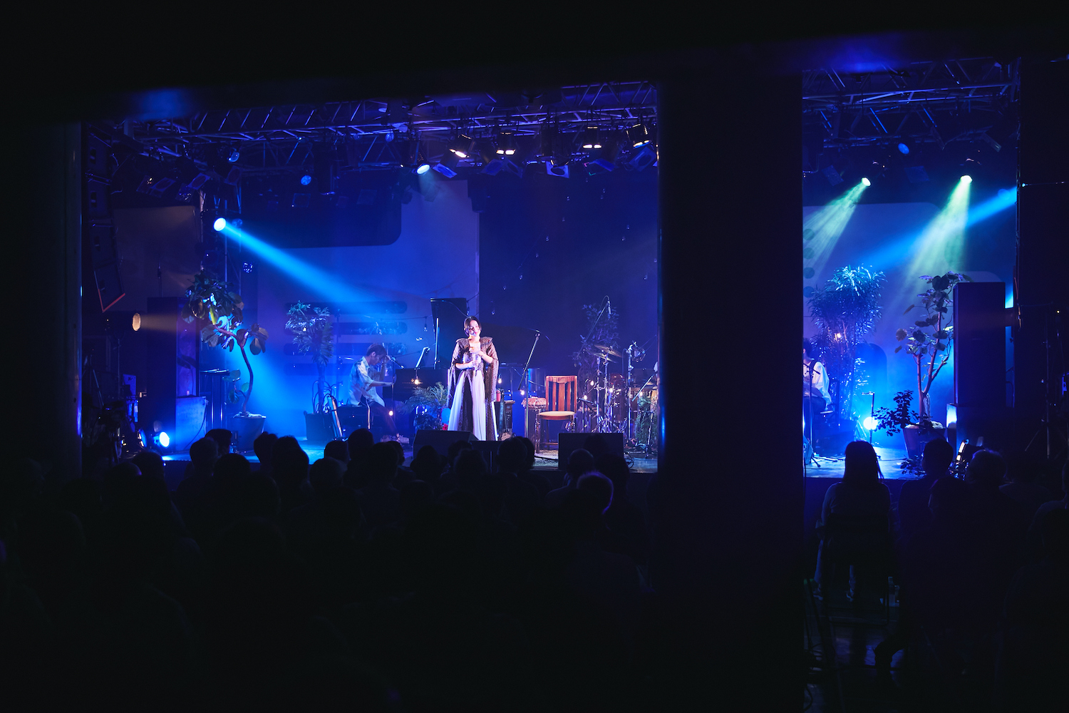 一転、ステージに赤い光が幾筋も差し込み、ピアノ、アコースティックギター、パーカッションのラテン的な躍動が鮮烈に彩ったのは、“皆既日食”をテーマにした「太陽とかくれんぼ」。奄美民謡で使われる、コブシにファルセットを混ぜた“グィン”を自在に操り、リズムに合わせて舞うようにステージを移動しながら、時折笑顔を見せながら歌う城は、生き生きとしている。
