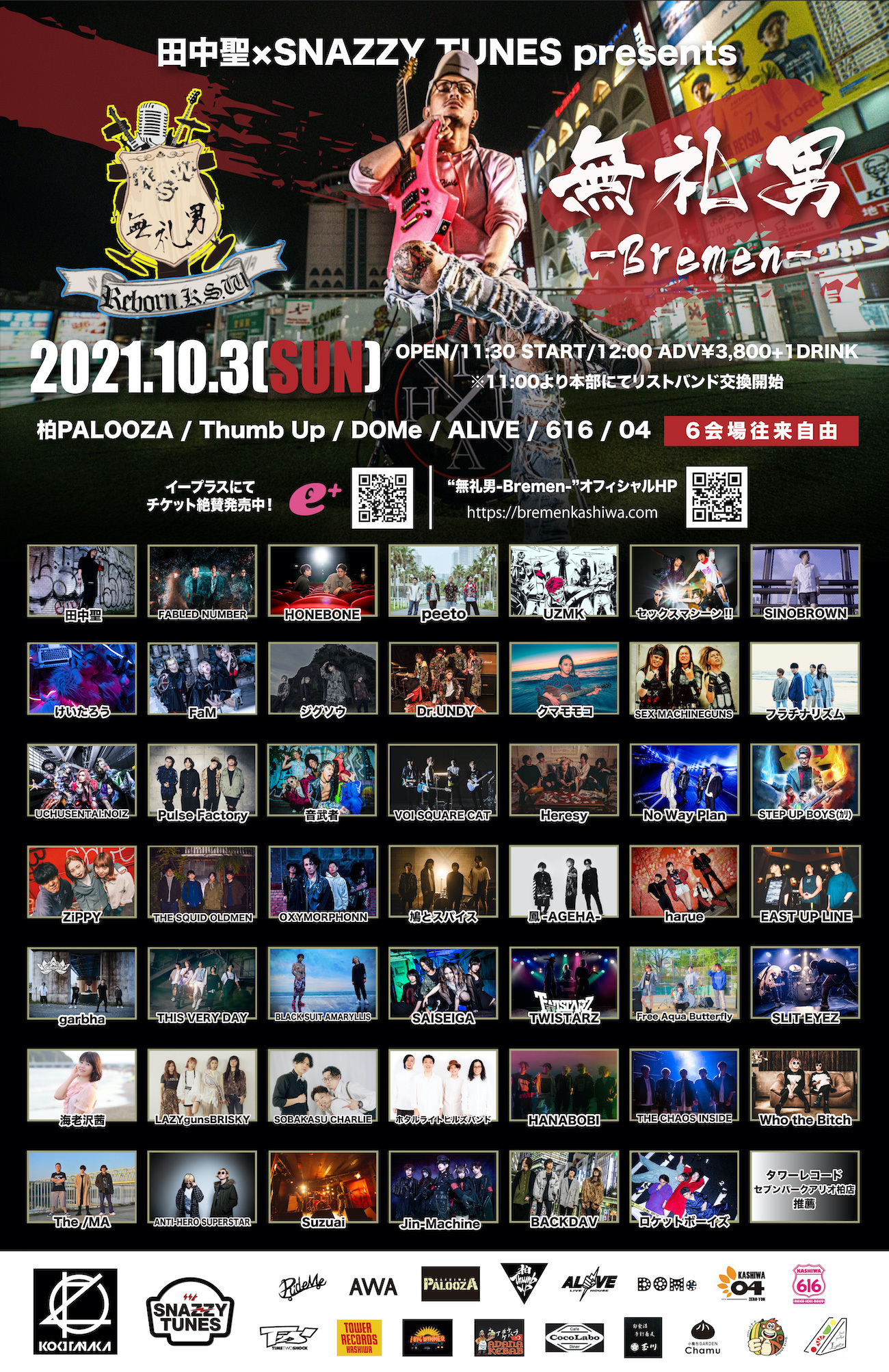 2021年10月3日(日)に柏の全スタンディングライブハウス6店舗で開催される、田中聖主催サーキットフェス『無礼男-Bremen-』の最終出演者12組が発表された。