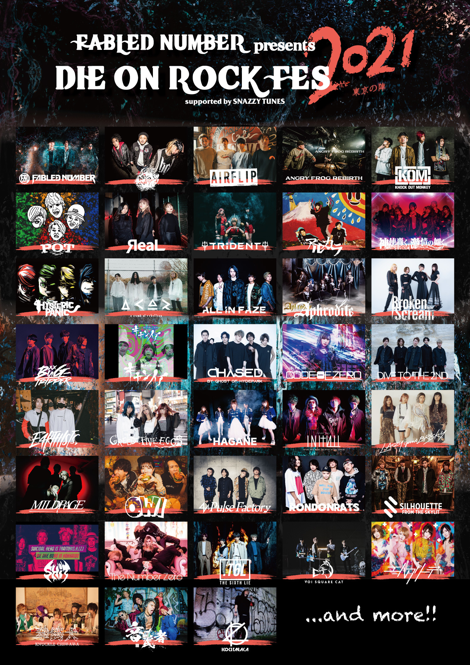 11月21日(日)にFABLED NUMBERが主催し下北沢12会場で行われるサーキットイベント『DIE ON ROCK FES 2021』~東京の陣~の第2弾アーティストが発表された。今回解禁されたのはa crowd of rebellion / ALL iN FAZE / Aphrodite / Broken By The Scream / BüG-TRIPPER / CANTOY / Chased by Ghost of HYDEPARK / CODE OF ZERO / DIVE TO THE 2ND / Earthists. / GREED FIVE EGG’S / HAGANE / INITIAL'L / LAZYgunsBRISKY / mildrage / OWl / Pulse Factory / RONDONRATS / SILHOUETTE FROM THE SKYLIT / Suicidal Hero is Traitor(S.H.i.T.) / The Number Zero / THE SIXTH LIE / VOI SQUARE CAT / エルフリーデ / ナックルチワワ / 音武者 / 田中聖の27組。これで合計38組となったがまだ半分以上の解禁を残しているとのこと。