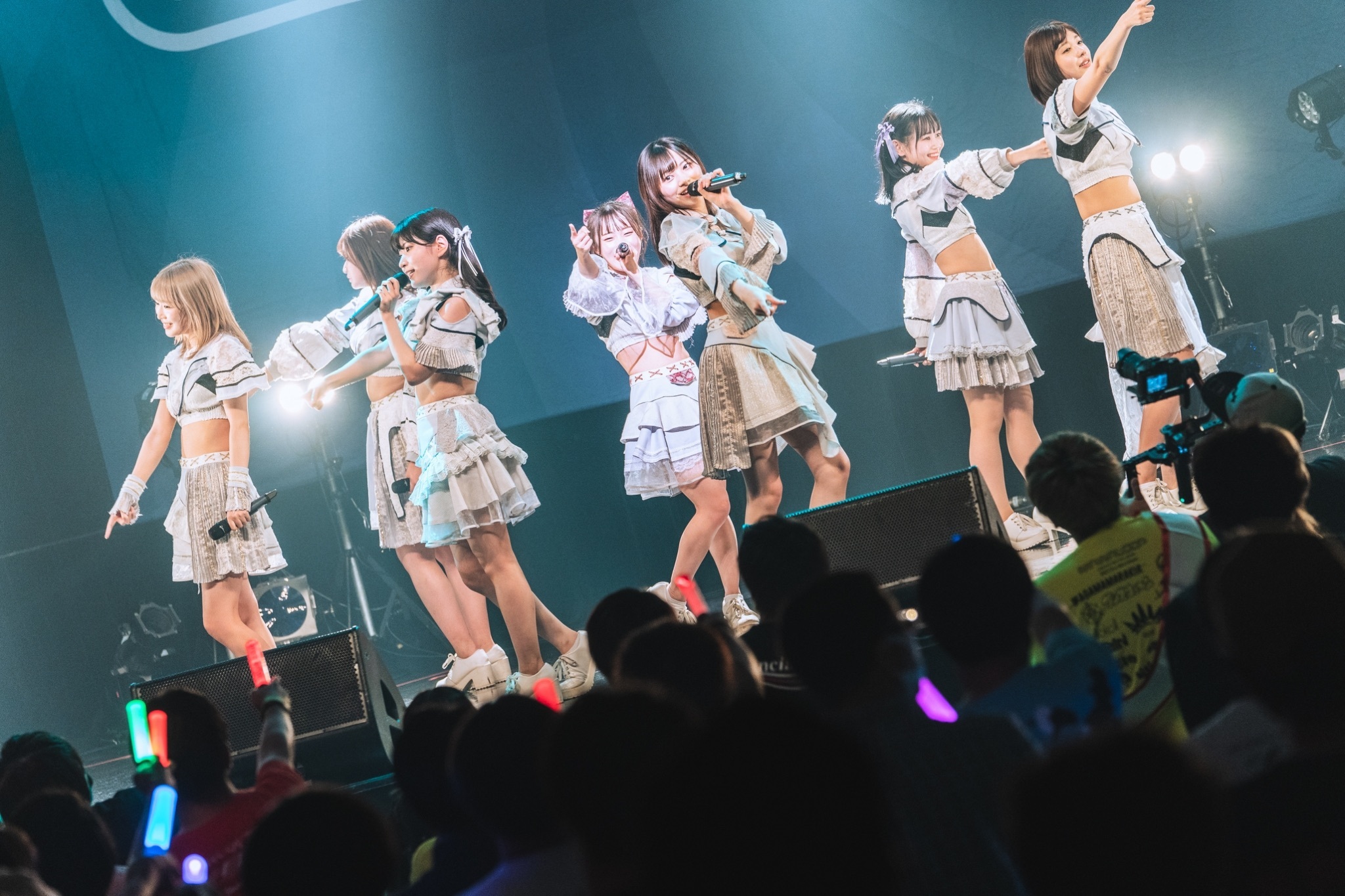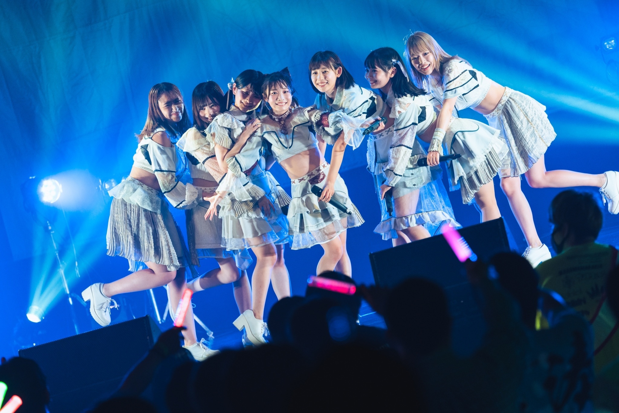 楽しさを全面に押し出す7人だが、実はこのステージにたどり着くまでが大変だったという。この日は静岡県を中心に降り続けた局地的な大雨の影響で新幹線が運休。急きょメンバーだけ飛行機で大阪まで飛び、さらになぜかリムジンで会場へ。そして、セットリストの内容がメンバーが思っていたものと違ったという。そんなわちゃわちゃした裏側は、いい意味でパフォーマンスにも表れていた。しかし、正統派なセツナソング「Clover」、細かい振りをビッと揃えてくる「ハナビガタリ」、ストレートな青春ソング「青春ギルティ」と、初のワンマンライブから3カ月しか経っていないなんて信じられないぐらい質の高いライブを展開。「圧倒的な顔面偏差値」という触れ込みの彼女たちだが、すごいのはビジュアルだけでないことをこの30分間の間に笑顔で軽やかに証明した。