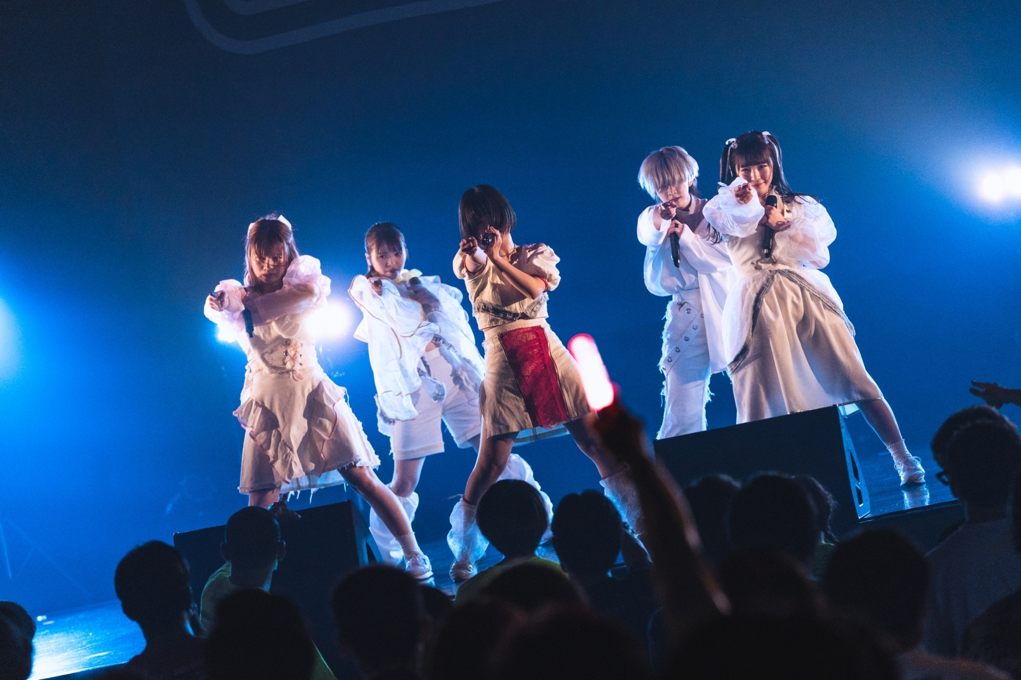 続いて登場したのは、真っ白な衣装で統一した5人組ワールズエンド。だ。テンションの高いオープニングSEからロックをベースにしたアップテンポな「エスオーエス!!」へとなだれ込む。「Distortion」「ドリーミン・ドリーミン」と徐々にBPMの高い楽曲を繰り出し、こちらの興奮を高めていく。どの曲もサビのリフレインの中毒性が高いため、より一層惹きつけられる仕様になっている。それを知ってか知らずか、5人のメンバーはゴリゴリに観客を煽っていくのだった。