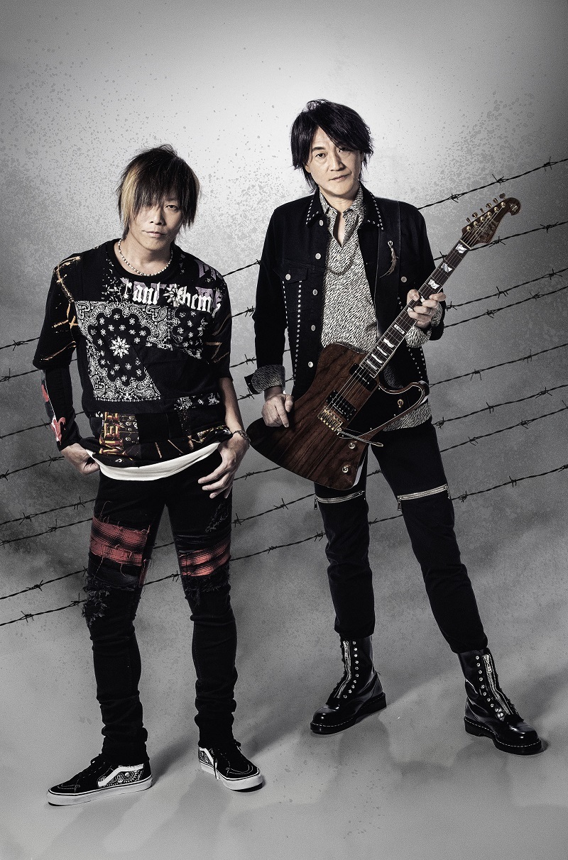 アーティストビジュアルでは、有刺鉄線とフェンス越しにクールな表情で魅せるGRANRODEO。ジャケットビジュアルでは、KISHOWのマイクスタンドとe-ZUKAのギターがダンベルと一体化しているという遊び心のあるデザインとなっている。