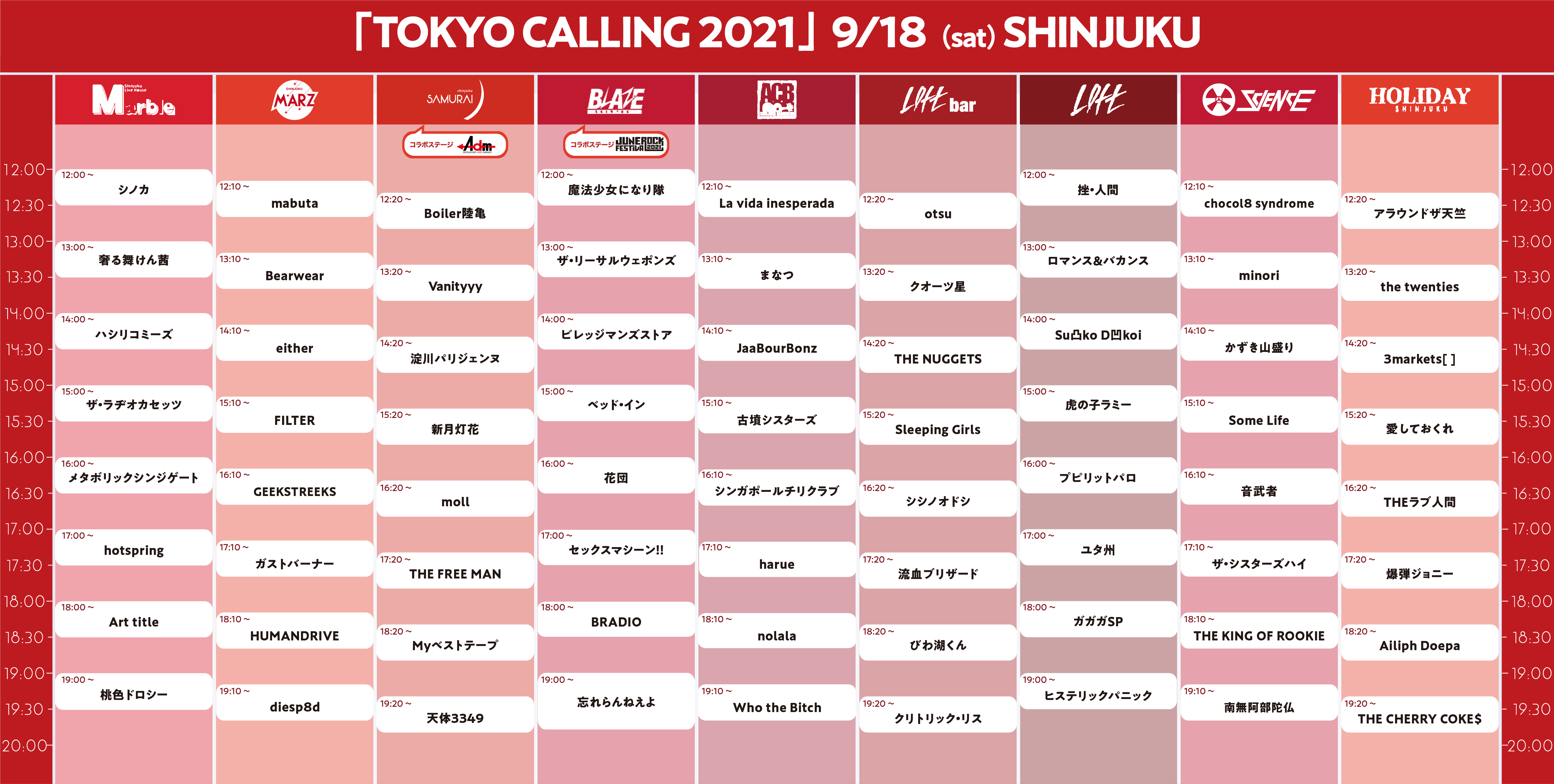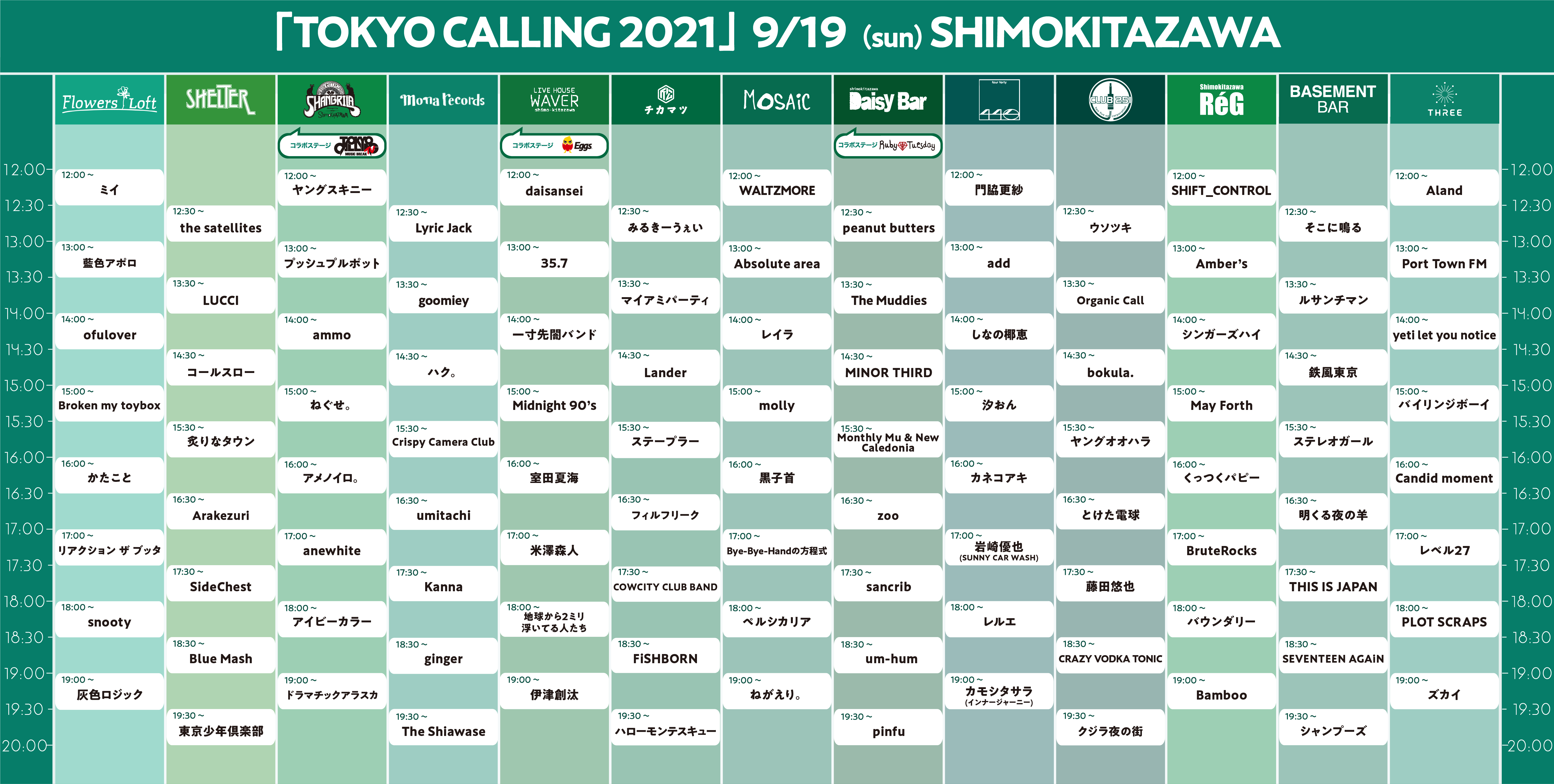 9月18日(土)新宿、9月19日(日)下北沢、9月20日(月・祝)渋谷の3日間に渡り開催される日本最大級のサーキットフェス「TOKYO CALLING 2021」のタイムテーブルが発表された。