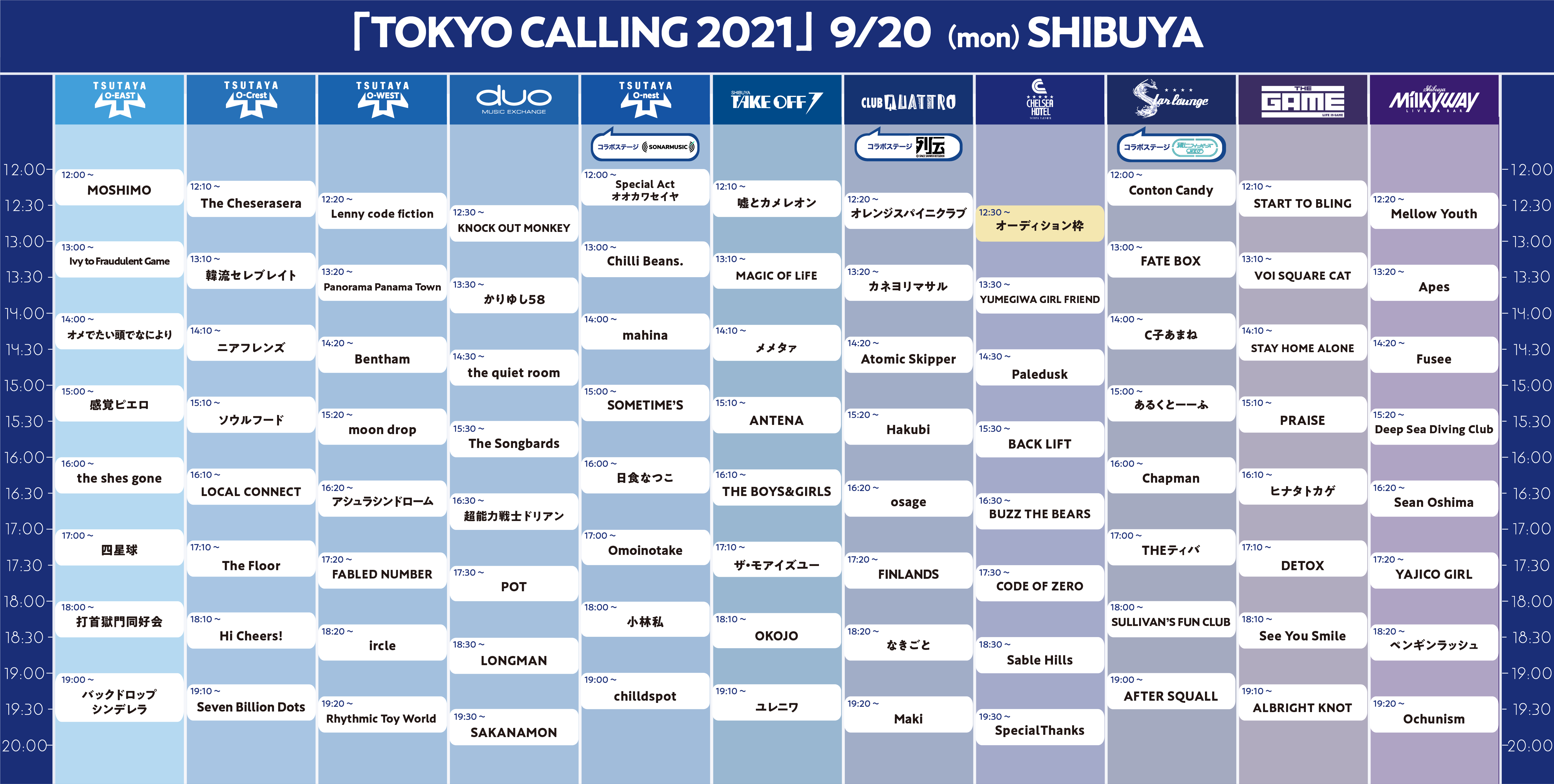 また、今年はTOKYO CALLINGとテレビ東京「ミュージックブレイク~TOKYO CALLING TV~」でTOKYO CALLING 2021への出演をかけたオーディションを無観客にて開催する。オーディション優勝者には9月20日(月)渋谷CHELSEA HOTELへの出演権が与えられる。審査員による審査と、TOKYO CALLING公式TwitterのオーディションツイートのRT数が、お客さんからの支持として審査に反映される。オーディション優勝者は9月2日(木)20:00に発表される。