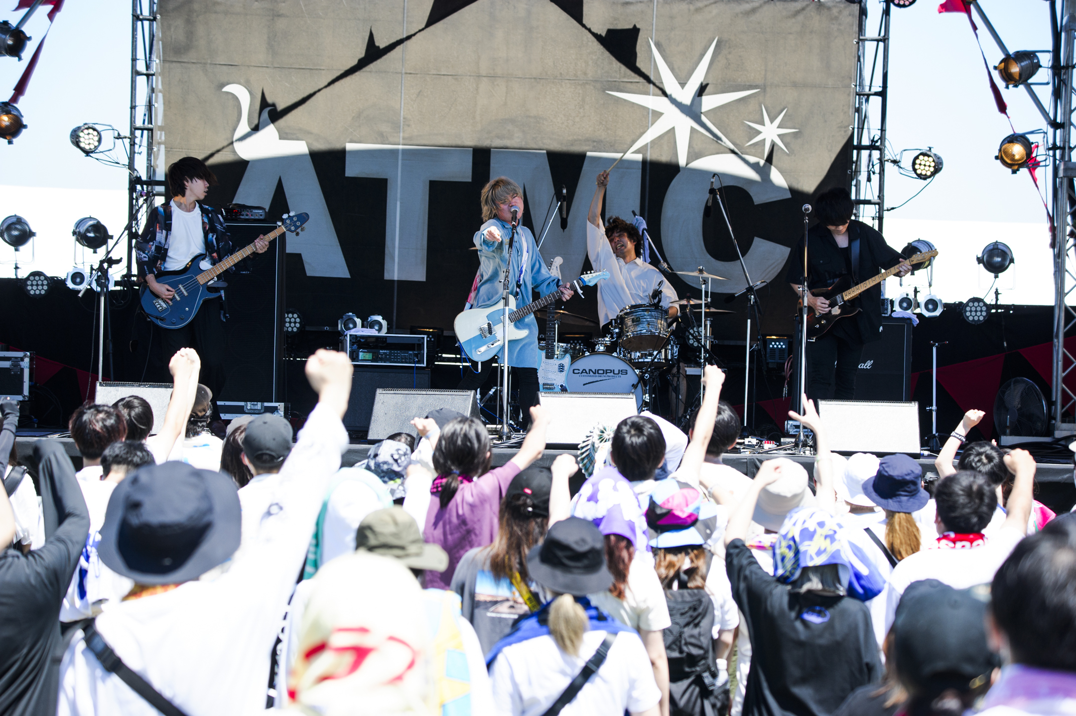 ATMCのトップバッターを飾るのは、ドラマチックアラスカ。のっけから勢いよく音をかき鳴らし、「東京ワンダー」でライブをスタート。<今しかない>と歌詞をヒジカタナオト(Vo.Gt)が叫ぶように歌ったり、畳みかけられるバンドサウンドの迫力に、1曲目からこのステージにかける並々ならぬ想いが伝わってくる。