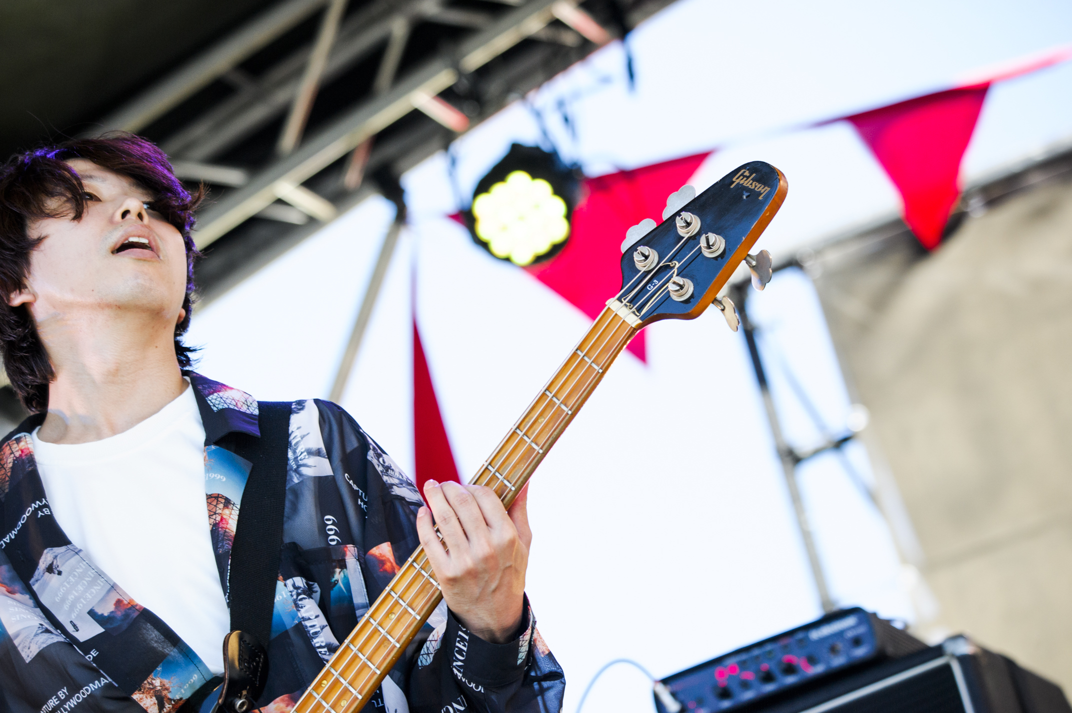 すると、ヒジカタは『RUSH BALL』が2018年以来の出演であることに触れ、「出れない間に、ライブハウスでめっちゃ強くなって帰ってきました。その間に得た経験と場数を見せつけて帰ります!」と宣言し、今度は「ジュブナイル」で会場のテンションもグングンと突き上げていった。<まだまだ走れる>という衝動的な歌詞が、ステージの勢いと重なりストレートに胸を打つ。さらに、8月25日(水)にリリースされたばかりのミニアルバムから表題曲「人間合格」と「CODE:RED」も披露。歌詞がいつも以上に、いまこの瞬間の自分自身やバンドとリンクしして胸が熱くなる。