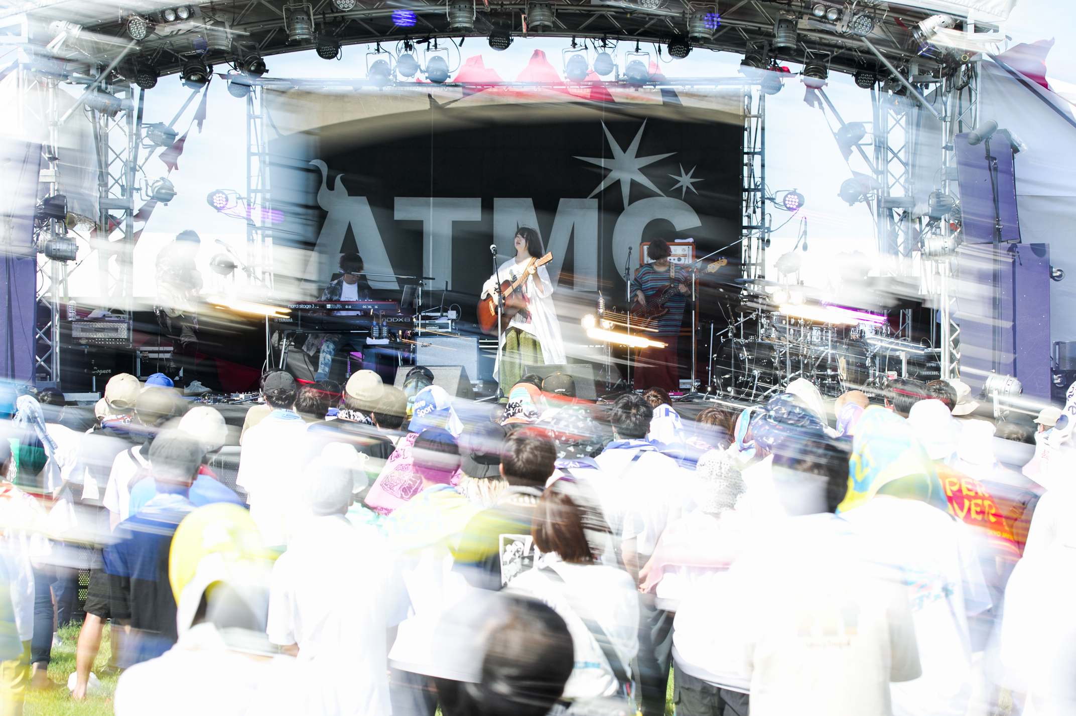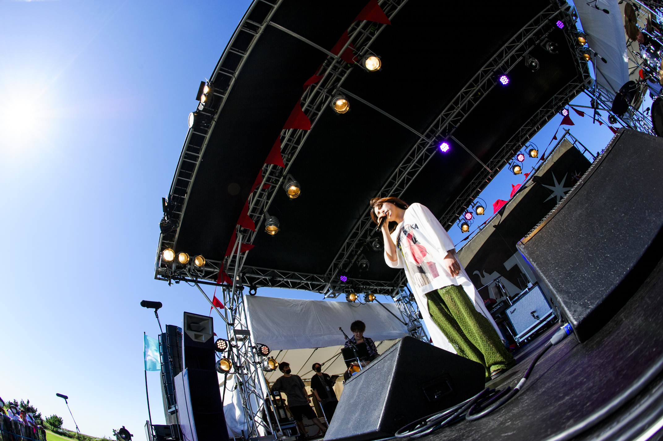 風が心地よい夕刻のATMCに登場したのは、シンガーソングライターのにしな。切なげな声で問いかけるようにして歌う「ダーリン」でライブをスタートさせると、瞬く間に観客の心を鷲掴みに。打って変わって今度は、同じく1stアルバム「odds and ends」に収録されているロックナンバー「真白」へ。バンドサウンドが楽曲のスケールを増大させ、にしなの歌声がより伸びやかに突き抜けていく。