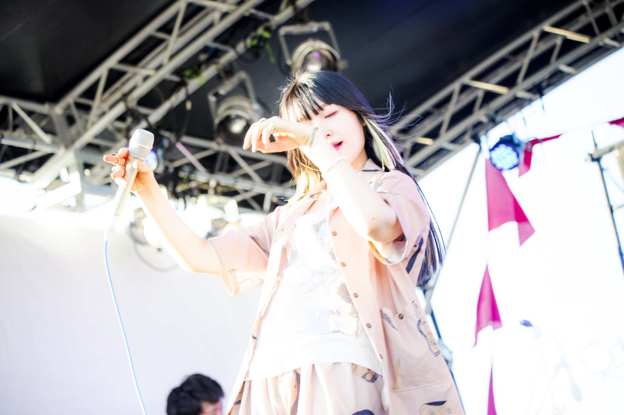 サビでは一斉にオーディエンスの手がアップ。その様子を見て、成田ハネダ(Key)が嬉しそうに笑顔を浮かべる。直射日光が当たる角度なので大胡田はかなり眩しいはずだが、そんなことを感じさせないくらい、サラサラの髪をなびかせて、ステージをくるくると踊るように歌う。