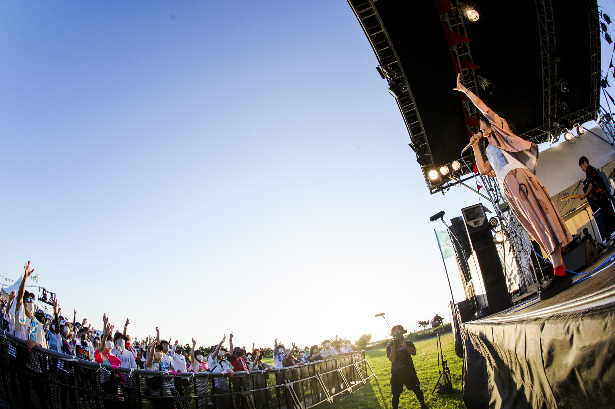 「どこでどうなるかわかんない日々だけど、今日は良かったね、面白かったね、楽しかったねという日になるといいなと思って歌ってます。みんなと、『RUSH BALL』との出会いに感謝して、あと2曲歌わせてもらおうかな」と大胡田がMCを挟み、「グッド・バイ」を演奏。サビのメロディーがポップで、オーディエンスも軽快に身体を揺らす。