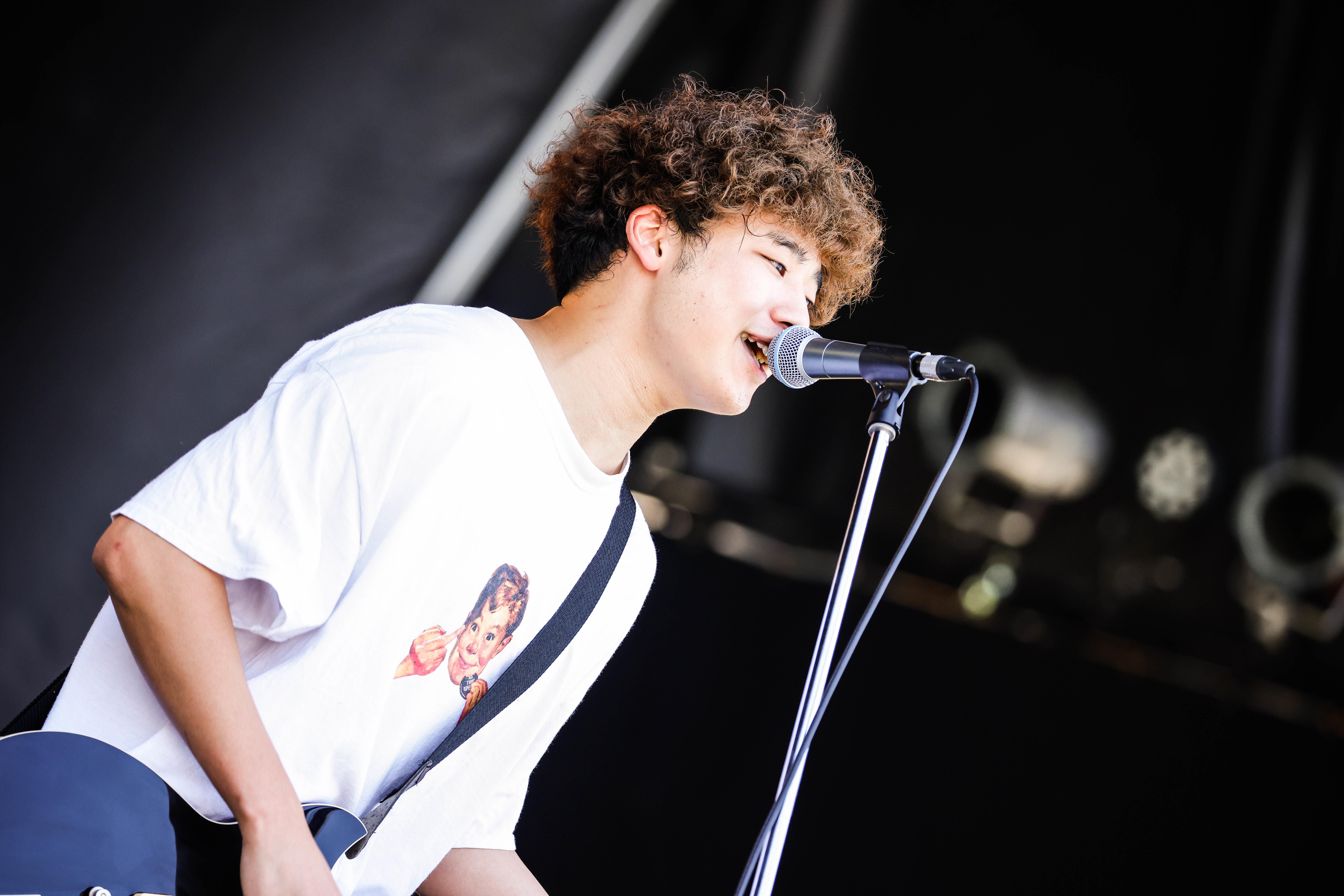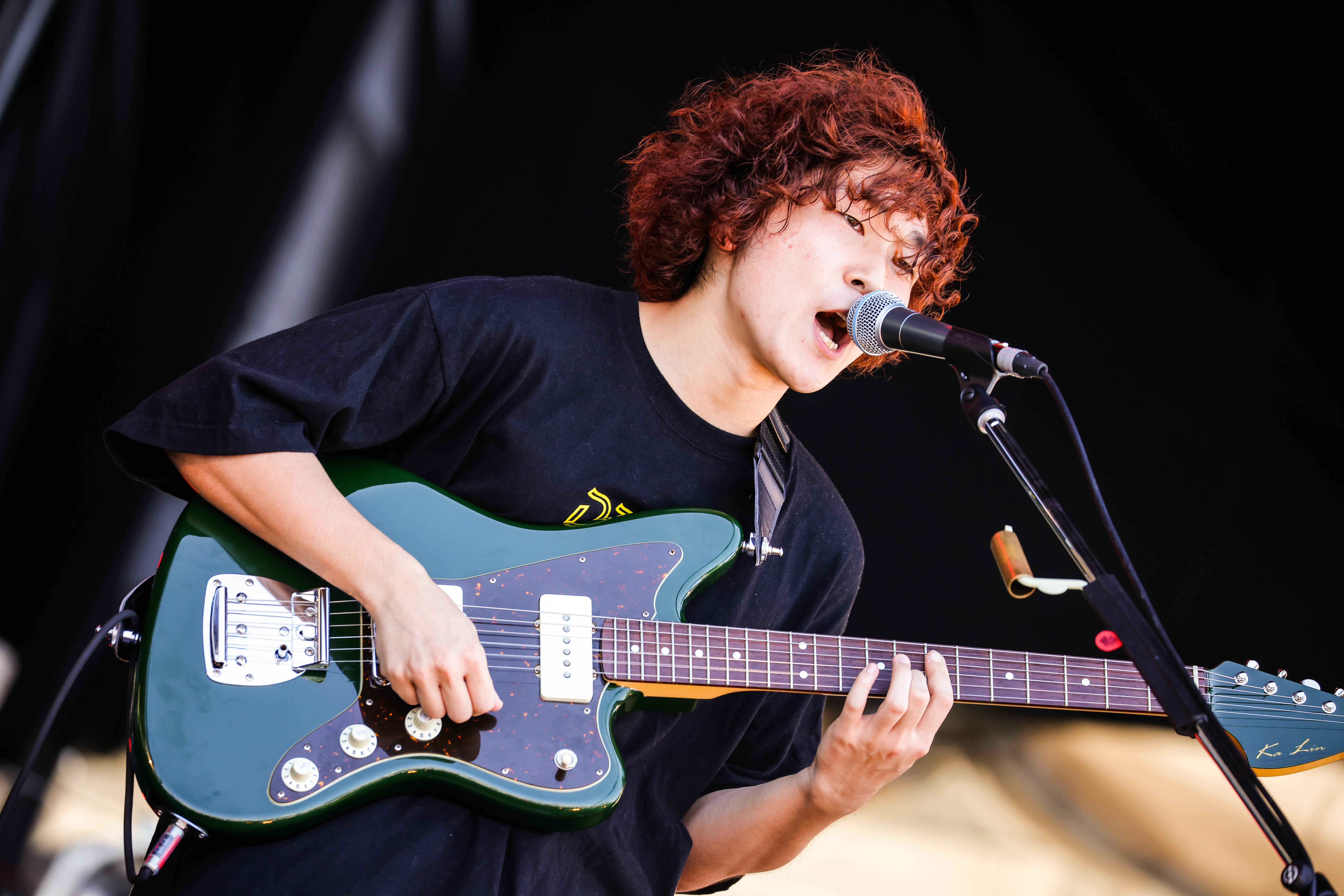 前日に続き快晴のDay2は、佐藤赳(Vo.Gt)の「『RUSH BALL 2021』へようこそ!」という元気なコールで幕開け。2年連続で2日目の「先鋒」を務める彼らは心得たもので、「ティーンエイジグラフィティー」のサビ始まりのボーカルでスイッチを入れ、初っ端から観客の両手を高々と突き上げさせる。