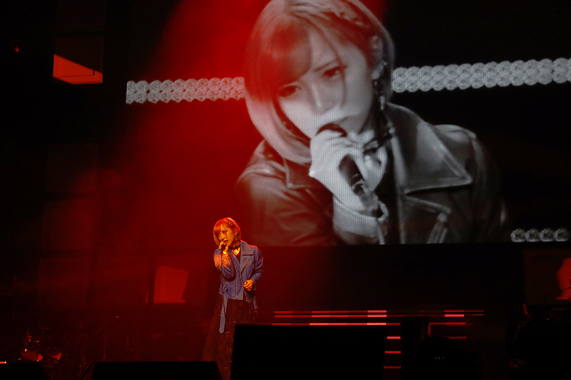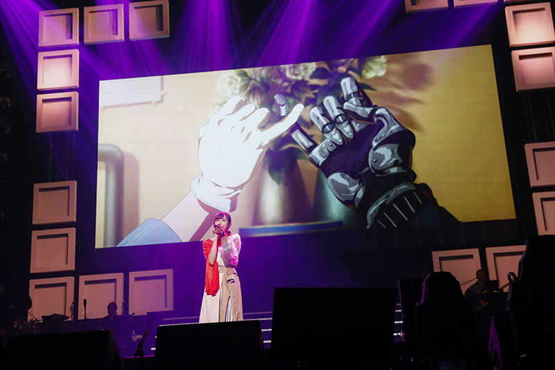 ライブもいよいよ終盤戦に差し掛かろうという所で、続いて登場したのはReoNaだ。暗闇の中からチェンバロの音色が聞こえてくると、 TVアニメ『シャドーハウス』EDテーマの「ないない」を披露し、会場はダークな世界観に包み込まれる。先日発売されたばかりのゲーム『月姫 -A piece of blue glass moon-』で主題歌を担当する「生命線」をライブ初披露したが、「やっぱりアニサマのステージですから、私自身を大きな舞台へと連れてってくれたこの曲を届けたいと思います」と語り TVアニメ『ソードアート・オンライン アリシゼーション War of Underworld』2ndクールOPテーマの「ANIMA」を歌うと会場のボルテージも最高潮へ。