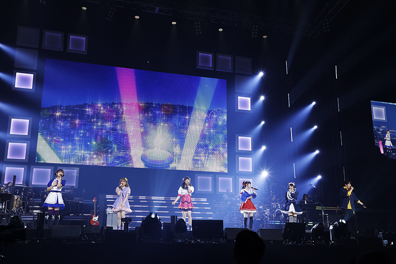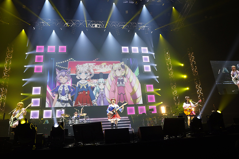 続く3番手はSHOW BY ROCK!!によるオンステージ。「今日のSHOW BY ROCKのステージ、トップバッターはDOKONJOFINGERなんだけど、まだ姿が見えないにゃあ……」というシアンの声が場内に響きわたると、舞台袖からママチャリを漕いでヤス役の伊東健人が登場。演奏した「移動手段はバイクです」では「名前だけでも覚えて帰ってください!よろしくお願いしまーす!!」というシャウトに応じてステージから火柱が上がる。舞台は暗転すると、Mashumairesh!!のメンバーがスクリーンに映し出される。緊張で震えるマシマヒメコの手をほわんが握り、鼓舞する内容のアニメが流れた後に「キミのラプソディー」、「エール アンド レスポンス」を演奏。ほわん役の遠野ひかるが「今日のためにたくさん練習して、アンダーノースザワから来ました!」と叫ぶ。ここで再び伊東健人とシアン役の稲川英里も合流し「SHOW BY ROCK!!としては5年ぶりのアニサマです」と語る。最後はアニサマバンドに演奏を任せ、全員で「アノカナタリウム」を歌唱したのだった。