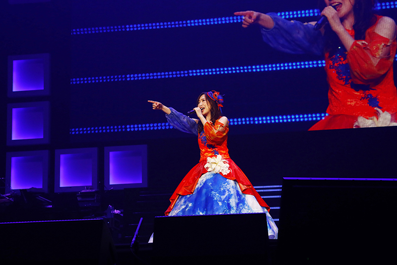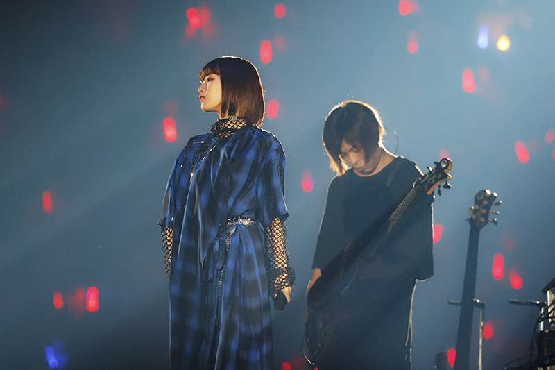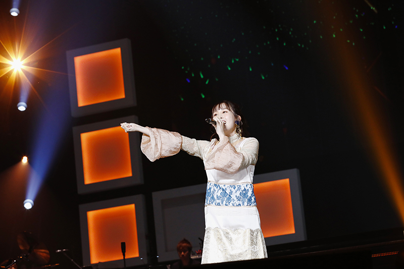 続いて暗闇の中からピアノ独唱にアレンジされた「ハミダシモノ」のイントロが聞こえてきた。アリーナ後方に特設されたバックステージにバンドメンバーを引き連れた楠木ともりが登場すると、一気に彼女の世界観へと誘われる。ソロとしては初のアニサマという事だが「“アニサマ”なので、アニメの曲をカヴァーしたいと思います。青いライトの海を見せてください」と言葉を残し、自身も大好きだと語るアニメ『僕のヒーローアカデミア』よりさユりの「航海の唄」をカヴァーした。
