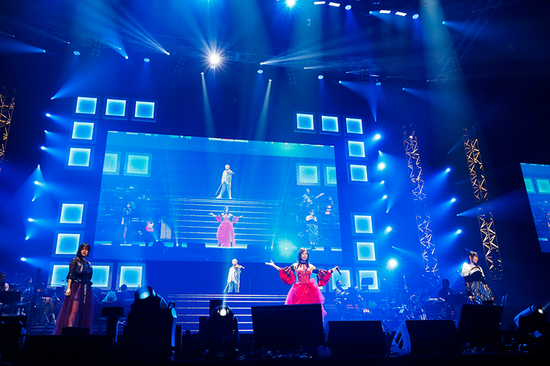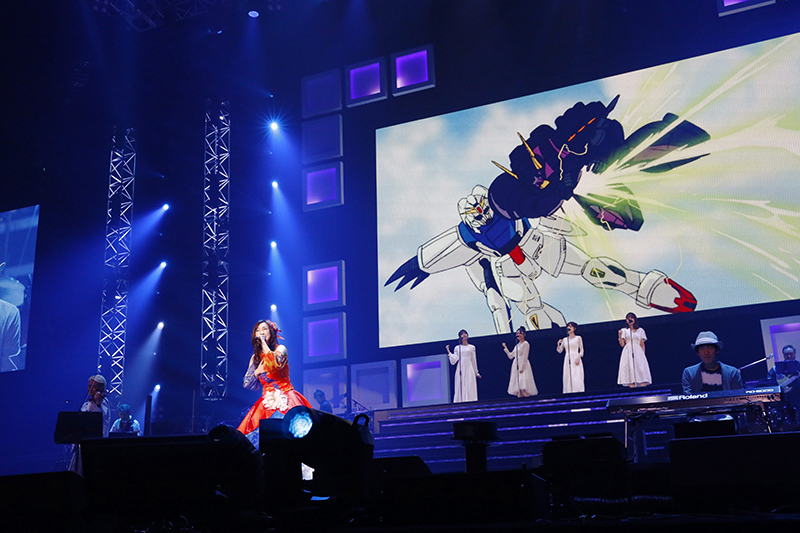 前半戦のトリを務めるのは、アニサマ9年ぶりの森口博子だ。「君を見つめて -The time I'm seeing you-」はヒロムーチョのやさしいサックスからスタートし、続く「一千万年銀河」では今井隼が伴奏による森口のピアノ独唱が会場を包み込む。「やっぱりこの空間は格別よね」と彼女が語るように、プレミアムなサプライズゲストとのコラボの連続が繰り広げられる。さらには森口とゆかりの深い酒井ミキオが登場し、ヴァイオリンのNAOTOとコーラスのHealer Girlsも加わる。「今、私たちは目に見えないモノと戦ってるけど、だからこそ目には見えない音楽の力を信じて、皆様に届けます」と披露した「ETERNAL WIND ~ほほえみは光る風の中~」は、こんな時代だからこそ聞きたかった1曲だ。数多くのガンダム作品を彩ってきた彼女だが、その中でも『機動戦士ガンダムF91』から2曲もピックアップされた事に驚くが、間違いない確かな選曲に、涙が頬を伝う。