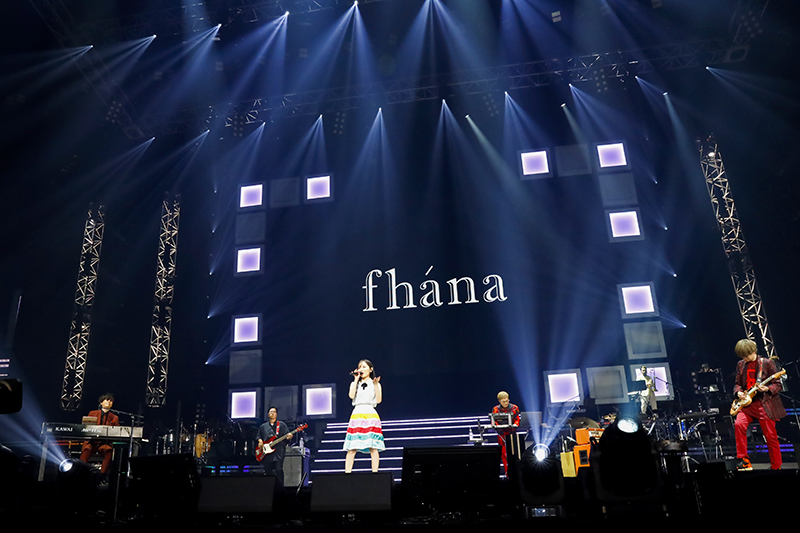 舞台は再びメインステージに戻り、fhánaが登場。COLORSのタイトルに相応しい虹のようなカラフルなスカートを身にまとったtowanaが先ず披露したのは劇場版『SHIROBAKO』主題歌の「星をあつめて」。リーダーの佐藤が「アーティストもスタッフも皆さんも、強い想いを抱いて今日この場にいると思います。それはアニサマやエンターテイメントだったり、アニメ/音楽への愛です。ボクらからの愛を最大出力で届けます」とTVアニメ『小林さんちのメイドラゴン』OPテーマ「愛のシュプリーム!」を奏でていく。Cメロからはサプライズでスーパーちょろゴンずの5人も加わると、まるでMVさながらの賑やかなステージが繰り広げられる。カンナ役の長縄まりあが「トール様、アニサマ、楽しい。マジやばくね?」と語りかけ、「カンナが楽しそうで何よりです。もう1曲くらい踊りたいですね〜」とトール役の桑原由気がtowanaに話を振り、「最後にみんなで”ちゅちゅいぇい”しちゃいますか!?」という事で「青空のラプソディ」を披露。リーダーの宣言通り、愛に満ち溢れた大団円のパフォーマンスを届けてくれた。