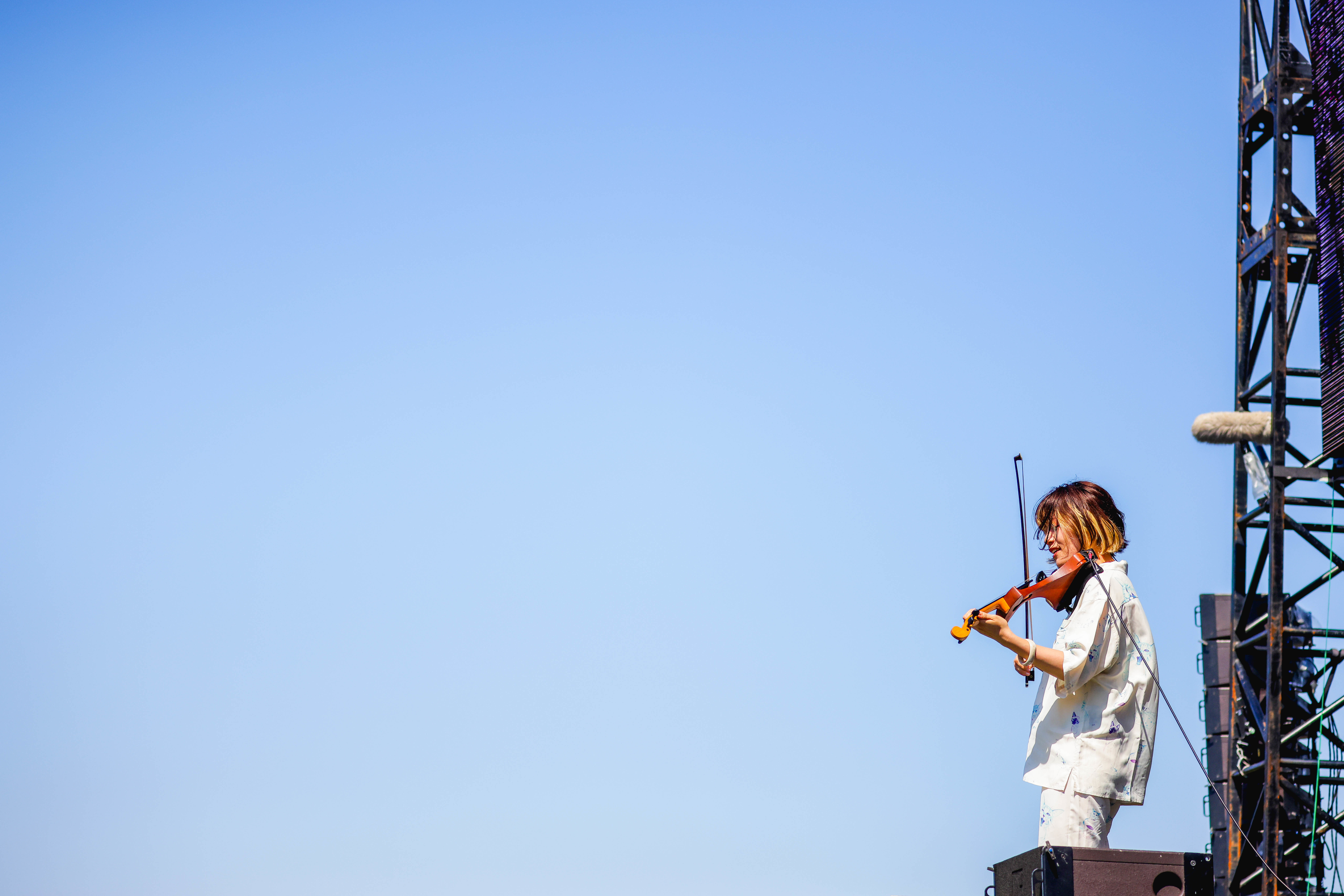 昨年、あらゆるフェスが停滞する中、厳しい制約の中で開催された『RUSH BALL』。BIGMAMAはその時のステージでも、模索しながら開催を決意した『RUSH BALL』への敬意を最大限に込めた楽曲を披露した。今年もまだ続く模索の中、全身で音を浴びる観客に向けて、東出真緒(Vio.Key.Cho)が奏でるバイオリンの涼しい音色と力強いバンドサウンドが溶け合う「神様も言う通りに」を演奏中、金井が言う。