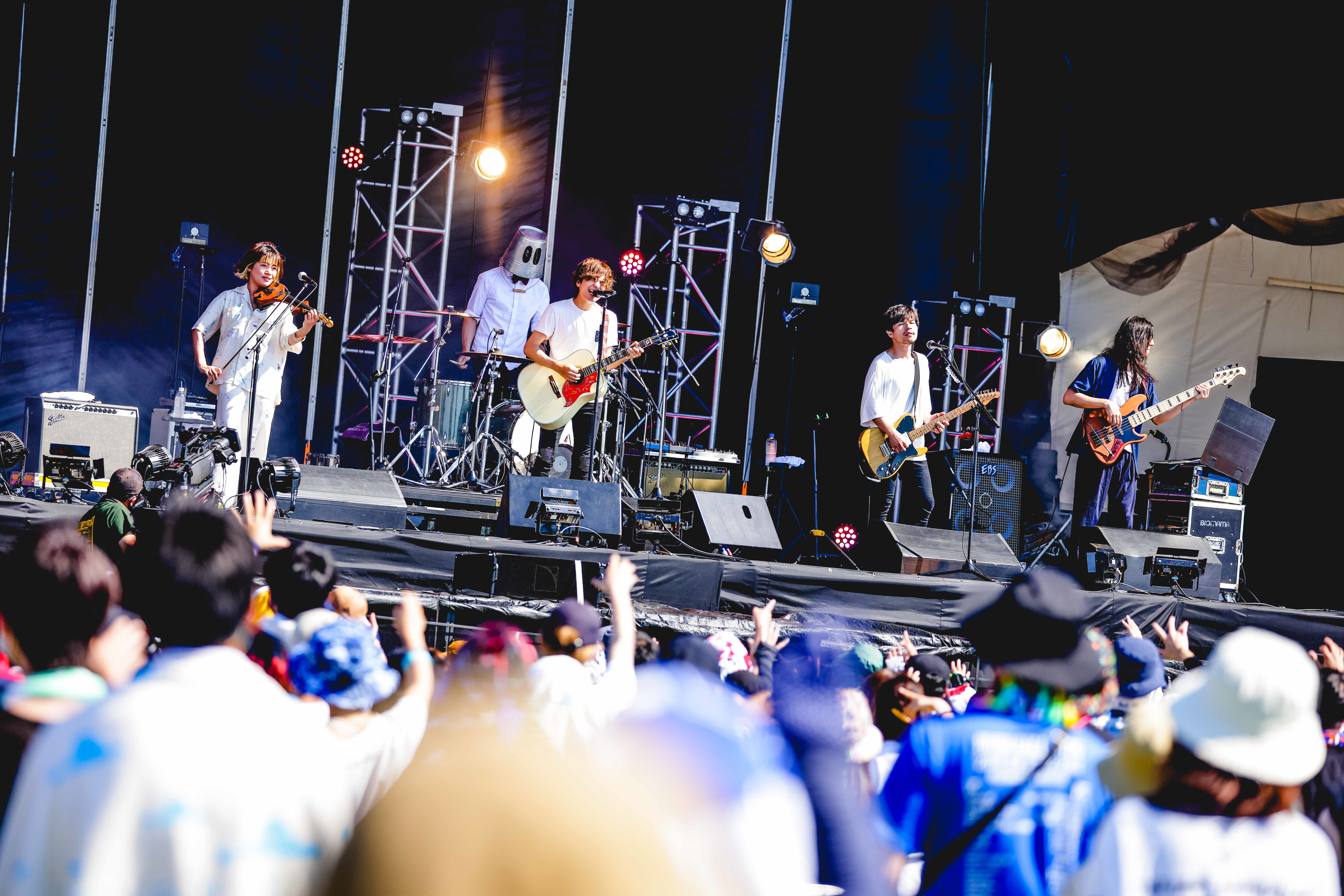 続いて披露されたのは、観客のシンガロングと熱狂が要となる「MUTOPIA」。オーディエンスたちは声の代わりに腕を高く上げて身体を揺らす。そこにはBIGMAMAはもちろん、さまざまなフェスやバンドTシャツやタオルを身につけたオーディエンスの姿が見える。フィジカルなディスタンスはキープしつつも、あらゆる垣根を越えて音と時間を共有するこの光景こそ、フェスの醍醐味だ。