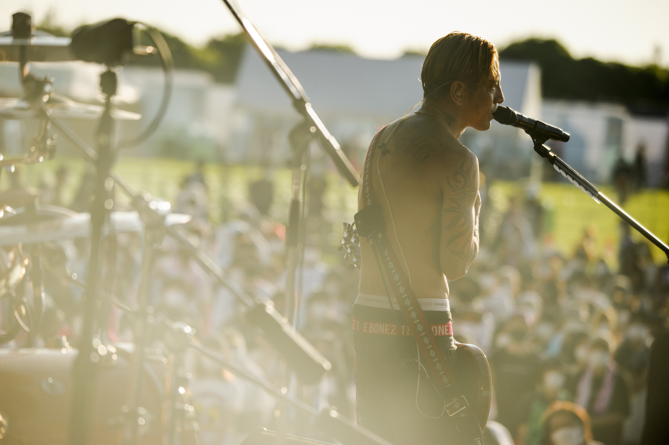 夕陽が眩しく差す中、すでに上半身裸のKj(Vo.Gt)と共にメンバーが最初に奏でたのは、<外へ出て音楽を楽しめばいい>と即興で歌詞を変えて歌われた、逆境の中でも前を向く決意の歌「陽はまたのぼりくりかえす」だった。