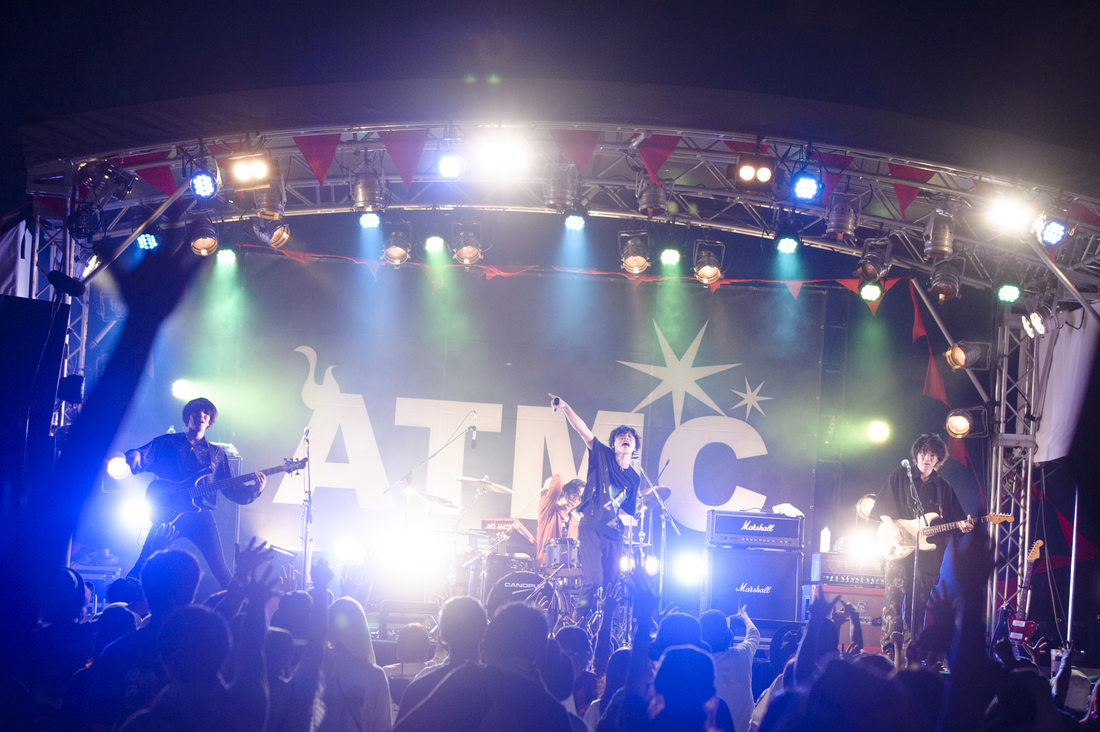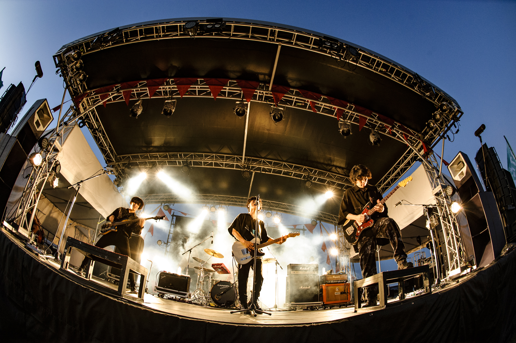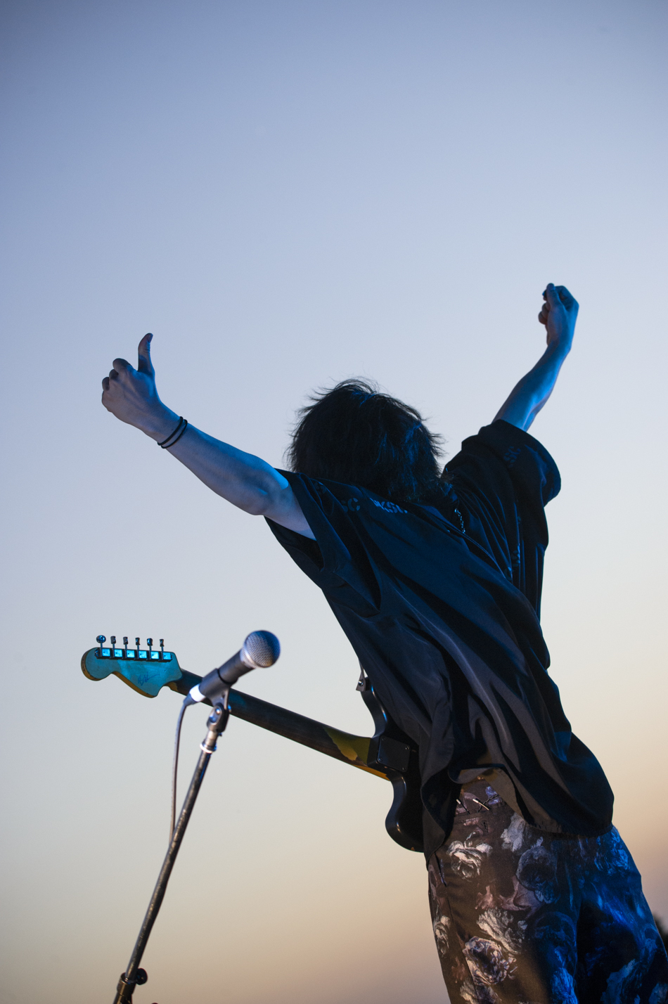 『RUSH BALL』初出演にして確かな印象を打ち鳴らした、神はサイコロを振らない。サウンドチェックではギャンギャンと耳をつんざくギターが響き、その音に釣られて続々と観客が集まってくる。ATMCは遮るもののない、開放感のあるステージ。夕暮れから夜に、ゆっくりと色彩が変わりゆく美しい空を眺めながら音に浸れる、抜群のロケーションのなかでライブが始まる。