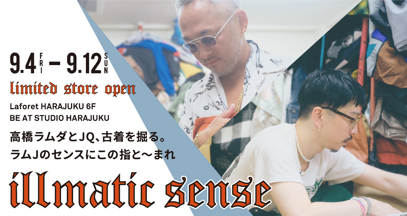 この企画は、さまざまなカルチャー情報を発信するメディア・BE AT TOKYOによるサポートのもと、東京・ラフォーレ原宿6Fにオープンしたコミュニティスペース・BE AT STUDIO HARAJUKUが手掛ける新たな企画『illmatic sence』。その名の通り「ヤバいセンス」を意味するこの企画では、BE AT TOKYOが注目するスタイリスト、ミュージシャン、デザイナー、ショップオーナーを軸に、それぞれの視点から古着のセレクトを行う。