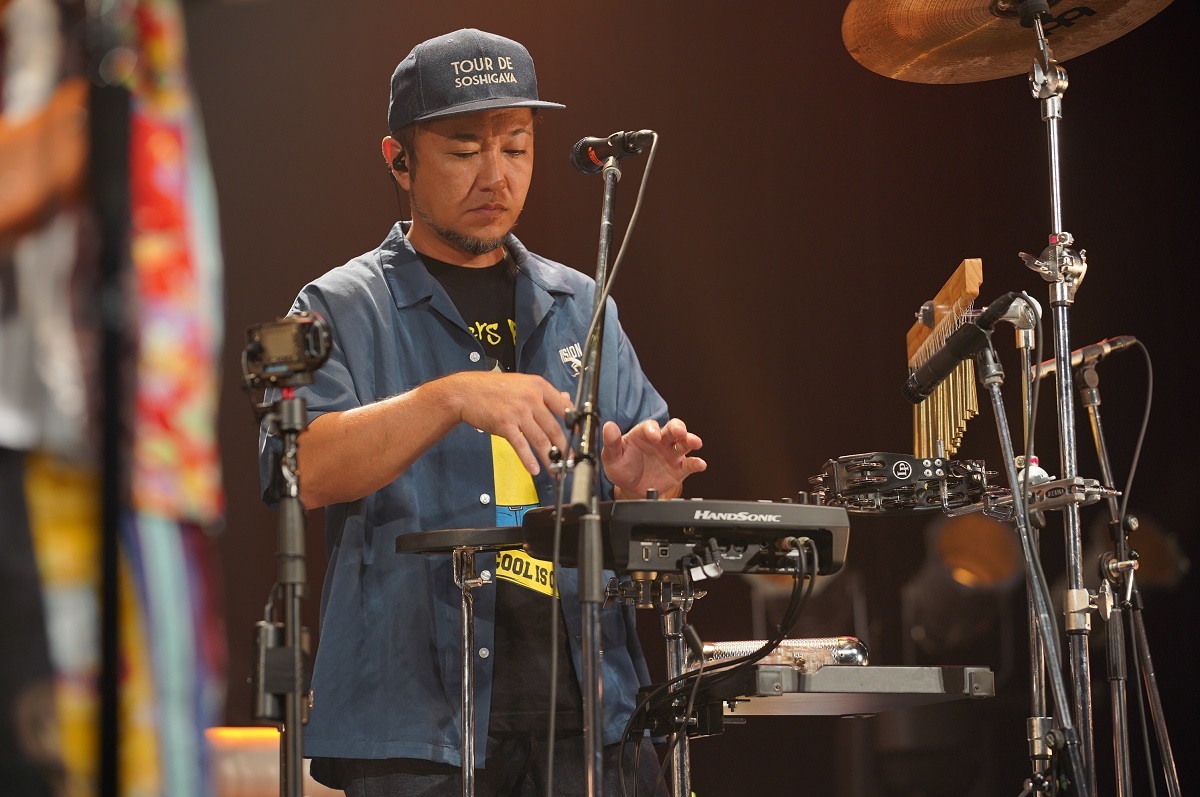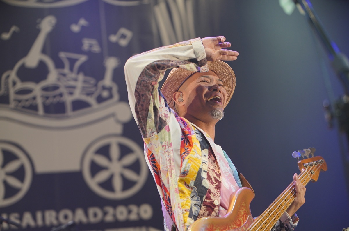 「はいさーい! 大変長らくお待たせしました。今日はいろんなことを我慢してもらうけど、目いっぱい楽しんでください!」(新屋)という挨拶の後は、スカのビートと愛らしいラブソングが一つになった「そばの唄」、モータウン的なベースライン、ロックロール系のギターが共鳴する夏ソング「オリオンビーチ」で心地よい高揚感を演出。ゆったりと身体を揺らし、手拍子で応える観客も、この場所をしっかりと楽しんでいるようだ。