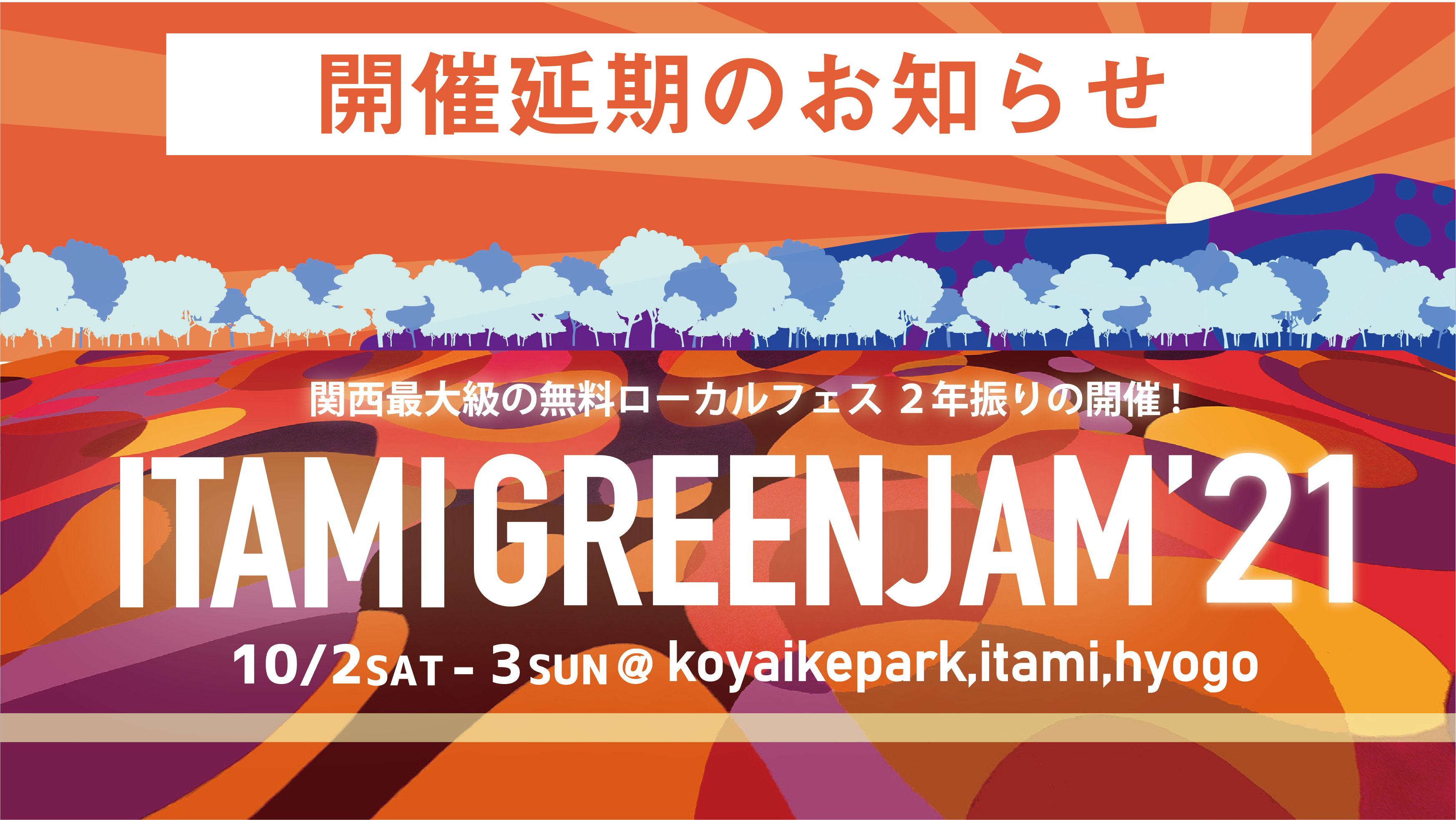 2021年10月2日(土)、3日(日)に兵庫県伊丹市昆陽池公園にて開催される予定だった、関西最大級の無料ローカルフェス『ITAMI GREENJAM’21』が開催延期を発表した。延期時期は未定。
