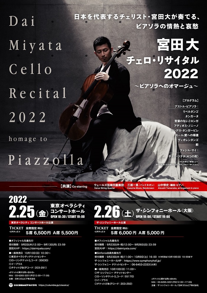 11月に発売されるアルバムは、今年生誕100周年を迎えた作曲家・ピアソラによる作品の数々を、ウェールズ弦楽四重奏団、三浦一馬(バンドネオン)、山中惇史(ピアノ・編曲)ら日本を代表する奏者を迎えて収録。宮田大の唯一無二の音色と高い技巧、そしてトップ奏者同士による密度の高いアンサンブルが繰り出される演奏で、数多く存在するピアソラ・アルバムとは一線を画す内容となっているとう。