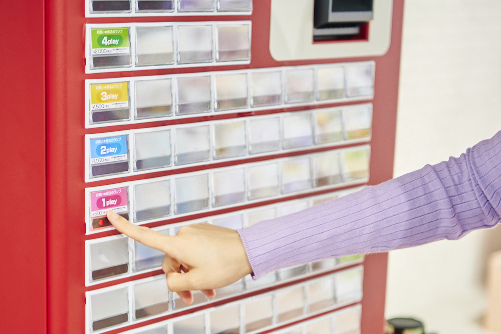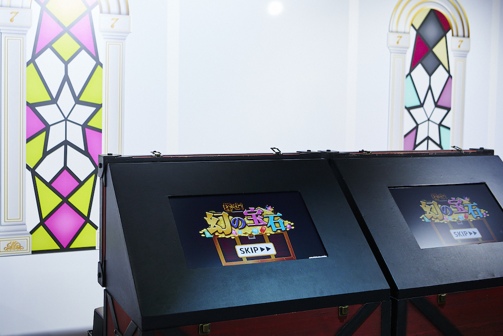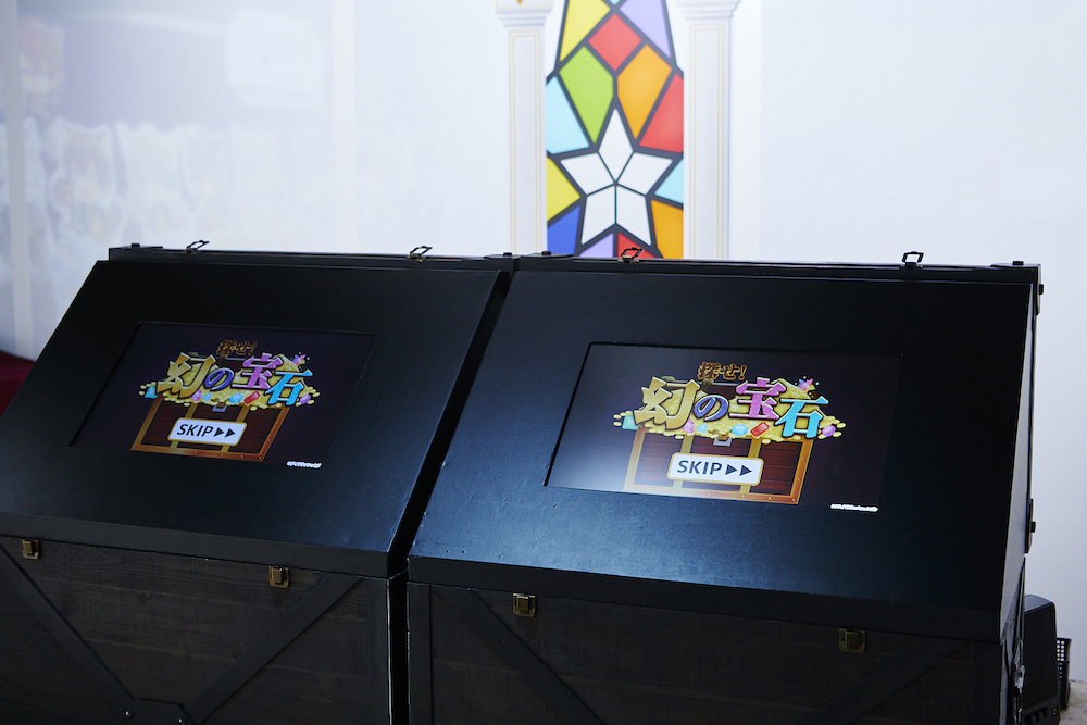 初めに気を付けなければいけないのは、宝箱の色によってもらえる景品が変わるので、探しに行く宝箱を間違えないように! 赤い宝箱は「IDOLiSH7、Re:vale、小鳥遊 紡、大神 万理、岡崎 凛人」、黒い宝箱では「TRIGGER、ZOOL、姉鷺 カオル、宇都木 士郎」が一緒に宝石を探してくれます。お好みの宝箱のチケットを券売機で購入して、お姉さんに渡して……