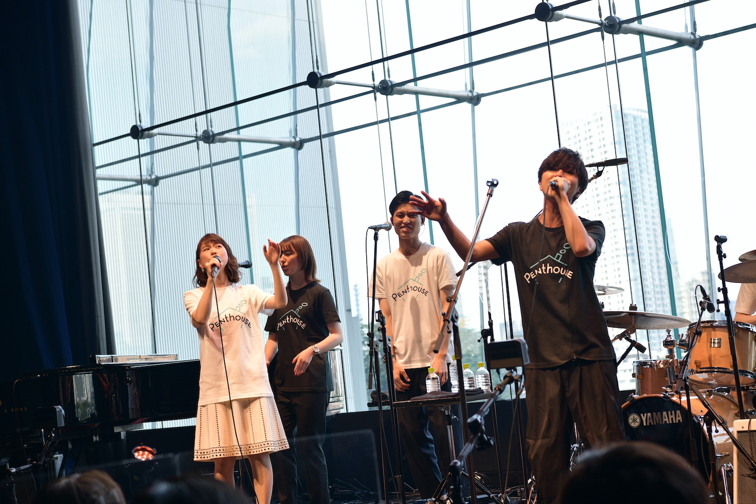 Penthouseの第1弾配信シングル曲である「Fireplace」からこの日のライブはスタート。グルーヴィーな中に温かみのある世界観で酔いしれた客席は、続く「ロング・サマーブレイク」、そしてカバー曲「Ain’t No Mountain High Enough」でアッパーに盛り上がっていく。