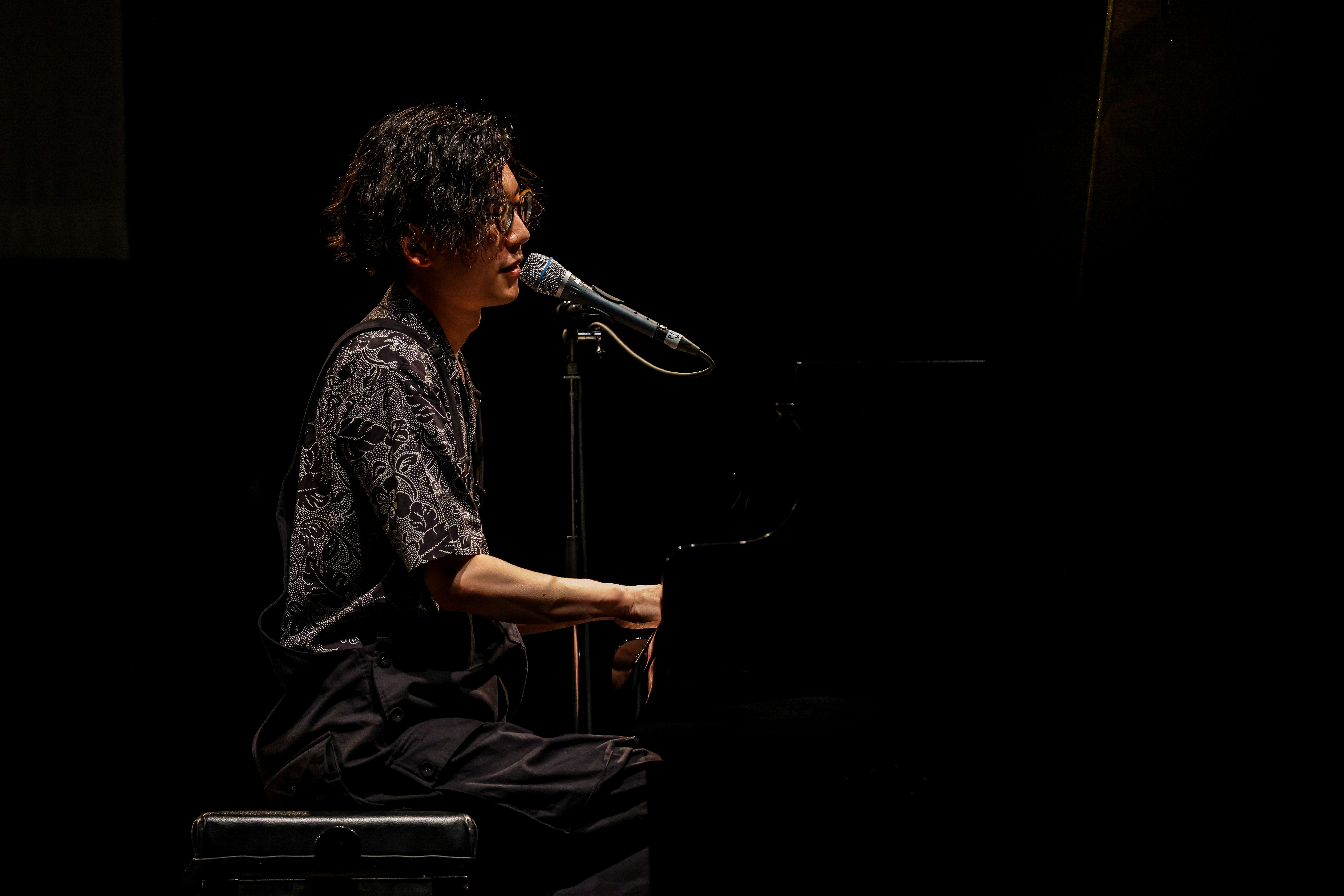 「僕もグランドピアノ少しだけ弾かせていただきます」と移動して、東京場所にも出演した『BABY Q 納涼祭』の「弾き語りという縛りを試されている」と話したり、「このイベントのスタッフとの現場は凄く安心する」と話したりと、演者と裏方の凄く良い関係性を感じた一幕であった。そこから、フィッシュマンズのカバー曲「いかれたBaby」へ。原曲以上にポツリポツリと歌うが、より歌詞がストレートに伝わってくる。そのまま「Stars In Your Eyes」もグランドピアノで演奏して、曲終わりのMCでは適度にライブをしないとしんどくなる事も明かす。そこからの「ほんとは」では細心の注意を払って、少しでも観客と心で触れ合おうと歌いかける姿も素敵だった。