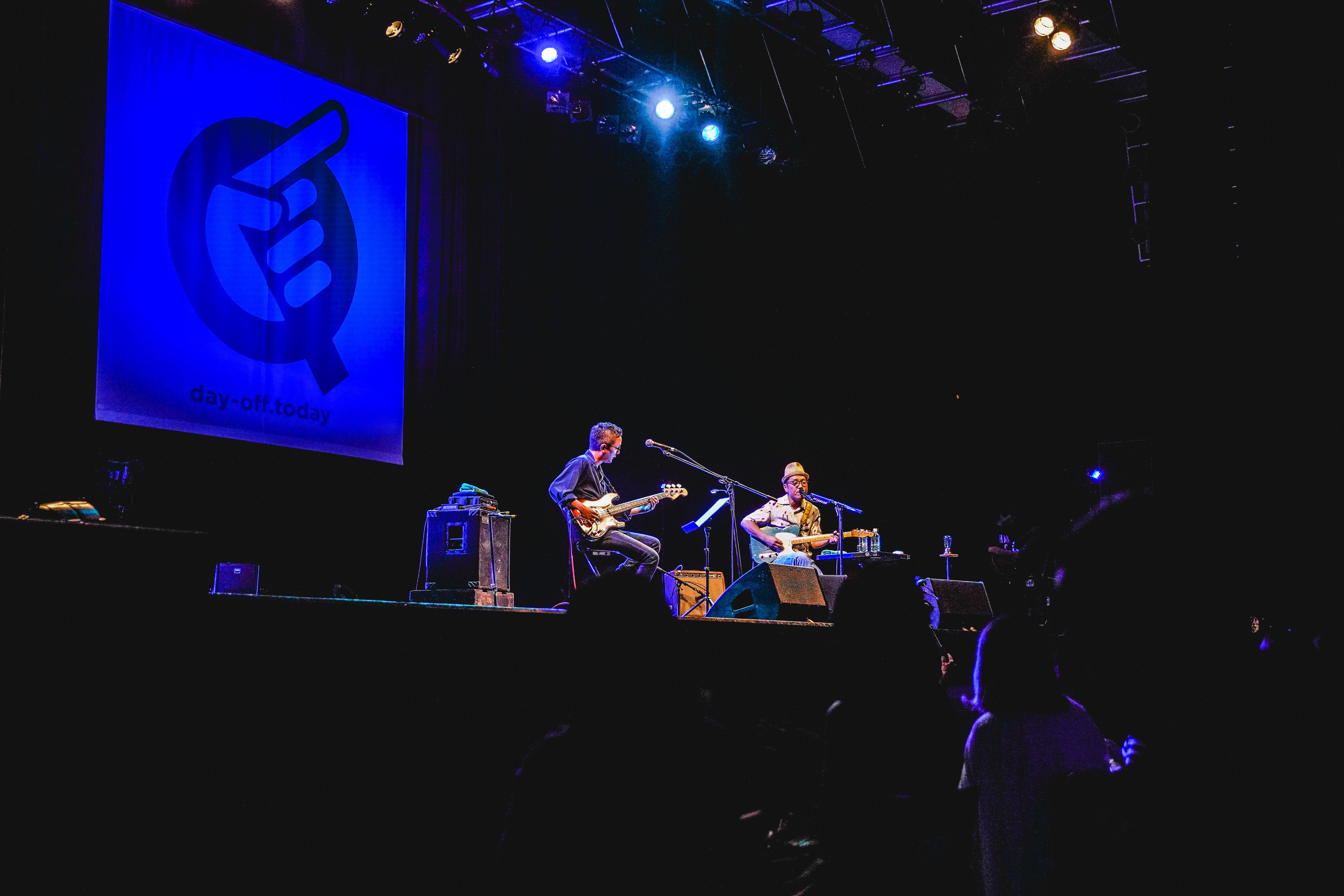 3番手はハナレグミ。イベントグッズの「休」と大きくデザインされた座布団で顔を隠しながら登場。何でもない事なのに、それだけでワクワクさせるから凄い。そして、エレキギターの弾き語りで「ハンキーパンキー」を自然に歌い出すが、よく考えたら今日初めて聴くギターの音だけに、なおさら新鮮さを感じる。続く「Peace Tree」では、音源ではスチャダラパーが担当していたラップを繰り出す。以前から思っていたが、永積崇は本当にラップが上手い。本来ラップを担当する人がいないから、替わりに歌い手がラップを担当しているという感じではなく、最初から歌い手が歌もラップも全て担っているというオールマイティーな凄みを感じる。歌い終わりに「色っぽいふたりが……、なんてスイートなふたりが……。でも、こっから僕と泰行がガラガラ声で歌います!」と笑い飛ばすが、いやいや、あなたたちの声は、若いふたりとはまた違う素晴らしさを持っているのですからと思わず言いたくなる!