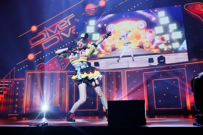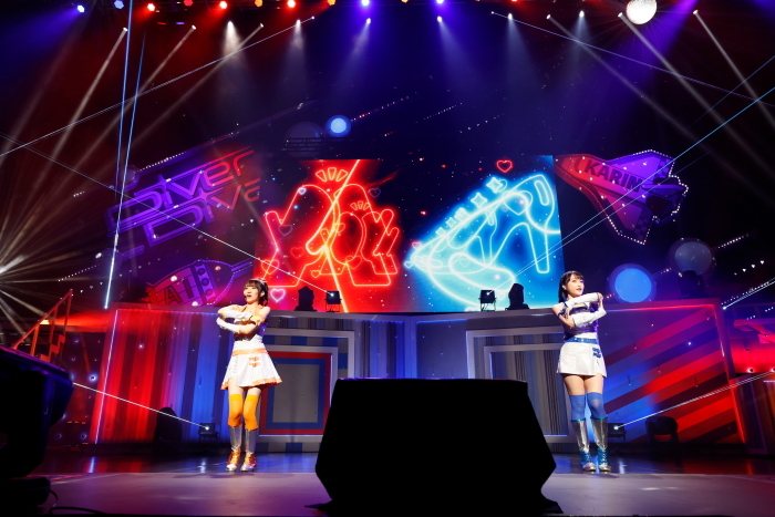前曲を終えた2人がリフトから降りると、イベント冒頭でも流れたエレクトリックサウンドが鳴り響き、スクリーンにはミラーボールが映し出される。DiverDivaのライブパートを締めくくるのはやはり始まりの曲「SUPER NOVA」だ。
