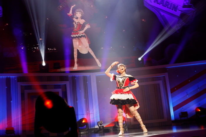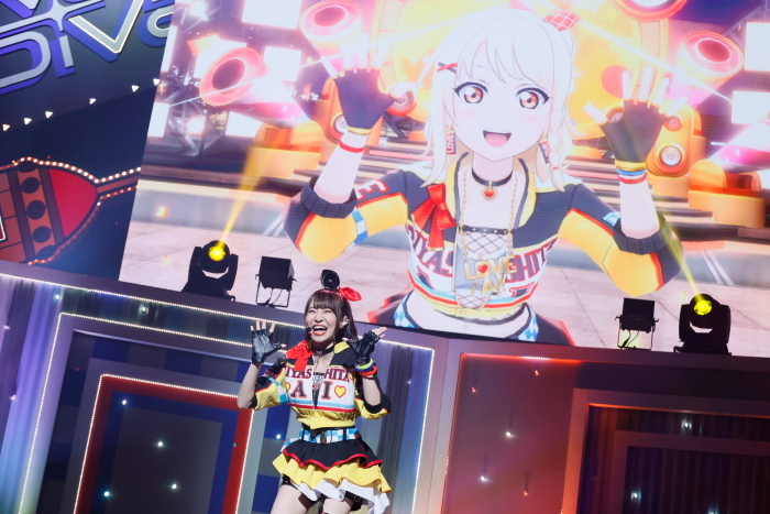 ステージにはフラメンコダンサー風のドレスをまとった久保田が登場し、そしてスクリーンには同じ姿の朝香果林が……ニジガクライブでおなじみの、ゲームのライブモード映像とのシンクロパフォーマンスだ。