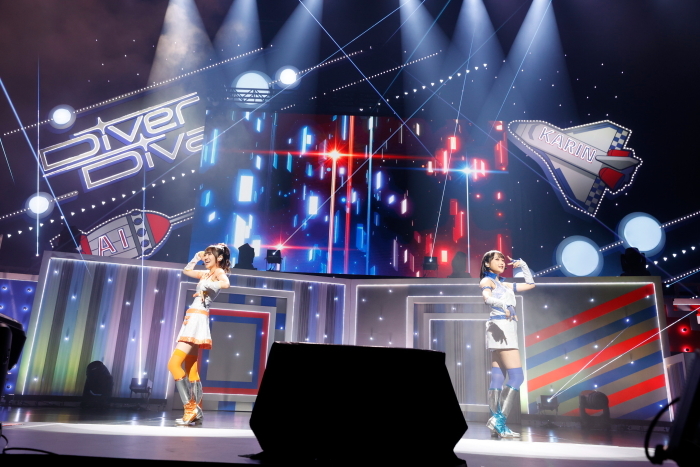 激しい前曲から一転して、今度は夏祭りの一夜を過ごす2人の想いを唄ったエモーショナルなナンバーに。スクリーンには打ち上げ花火が映し出され、ブルーとオレンジのライディングが日が沈む間際のマジックアワーのような色合いを生み出す中、ステージに仕込まれていたリフトが2人を会場上空へと誘っていく。満場を埋めつくしたコンサートライトの灯りと打ち上げ花火の映像に囲まれて、DiverDivaも夏の夜空の星になったかのように思わせる演出が見事なステージとなった。