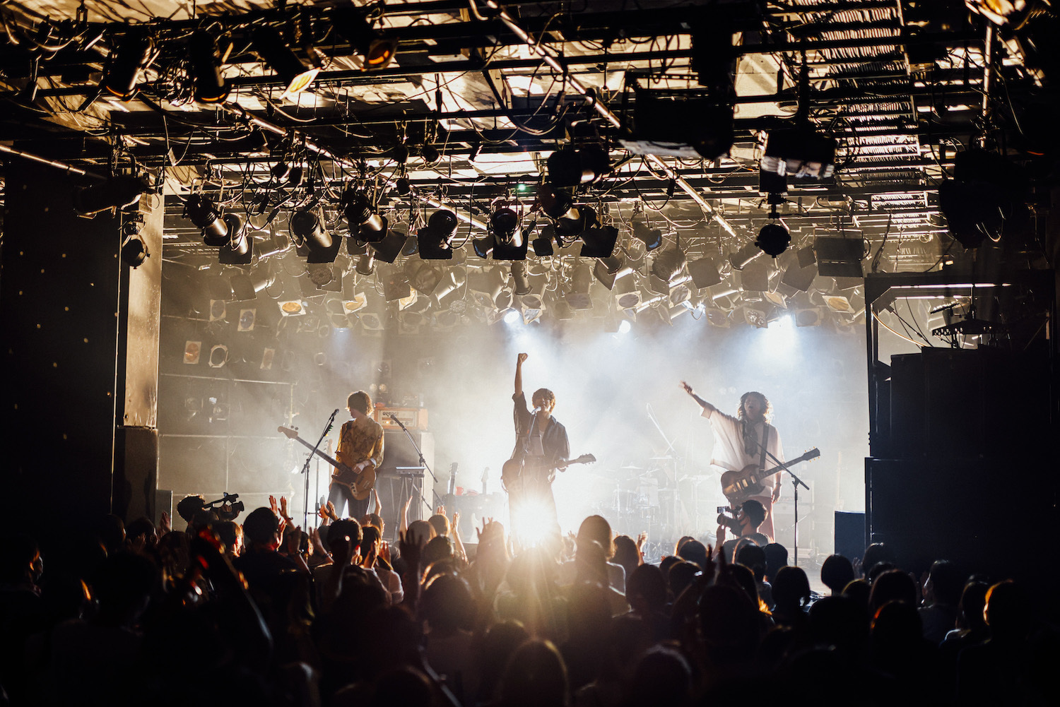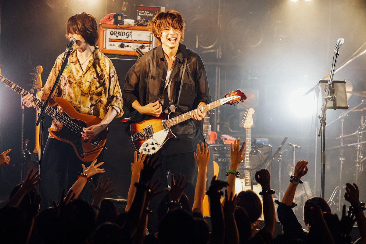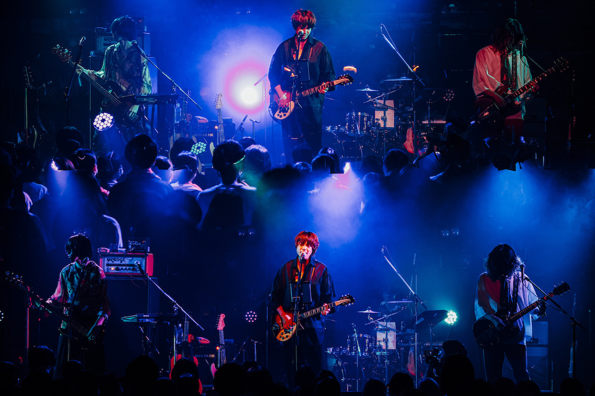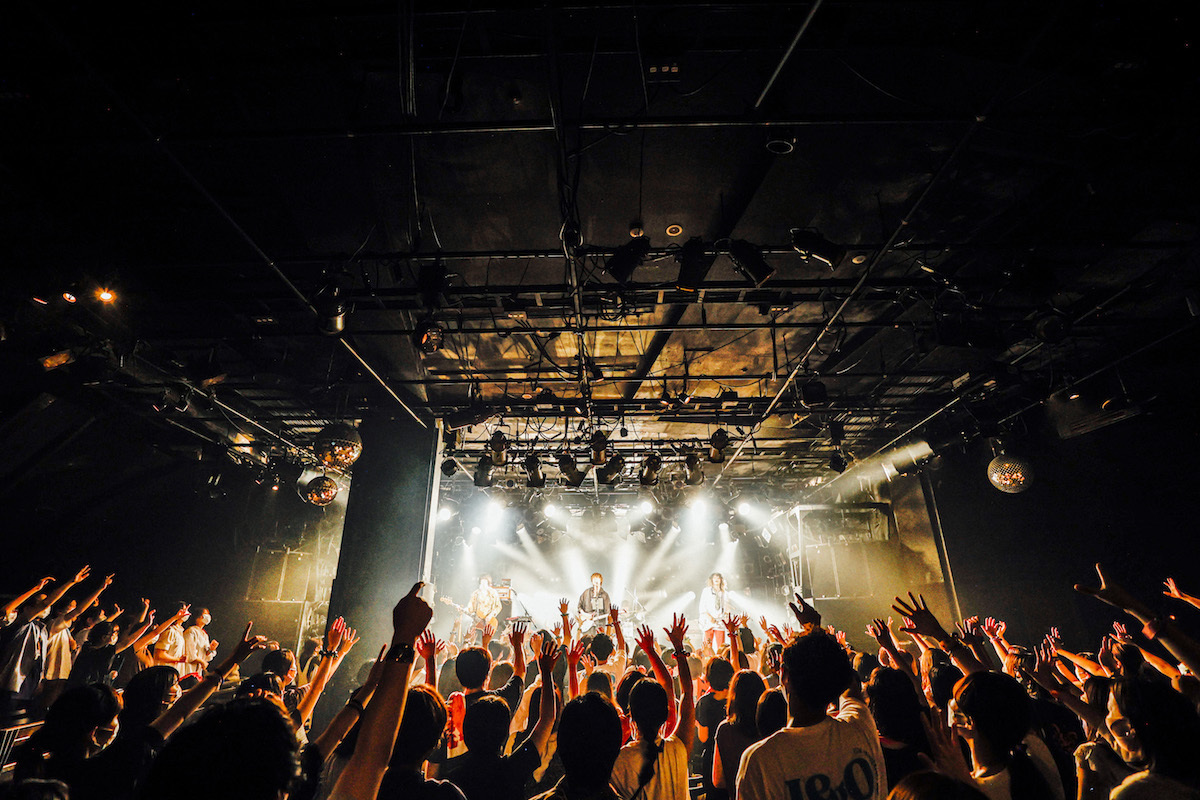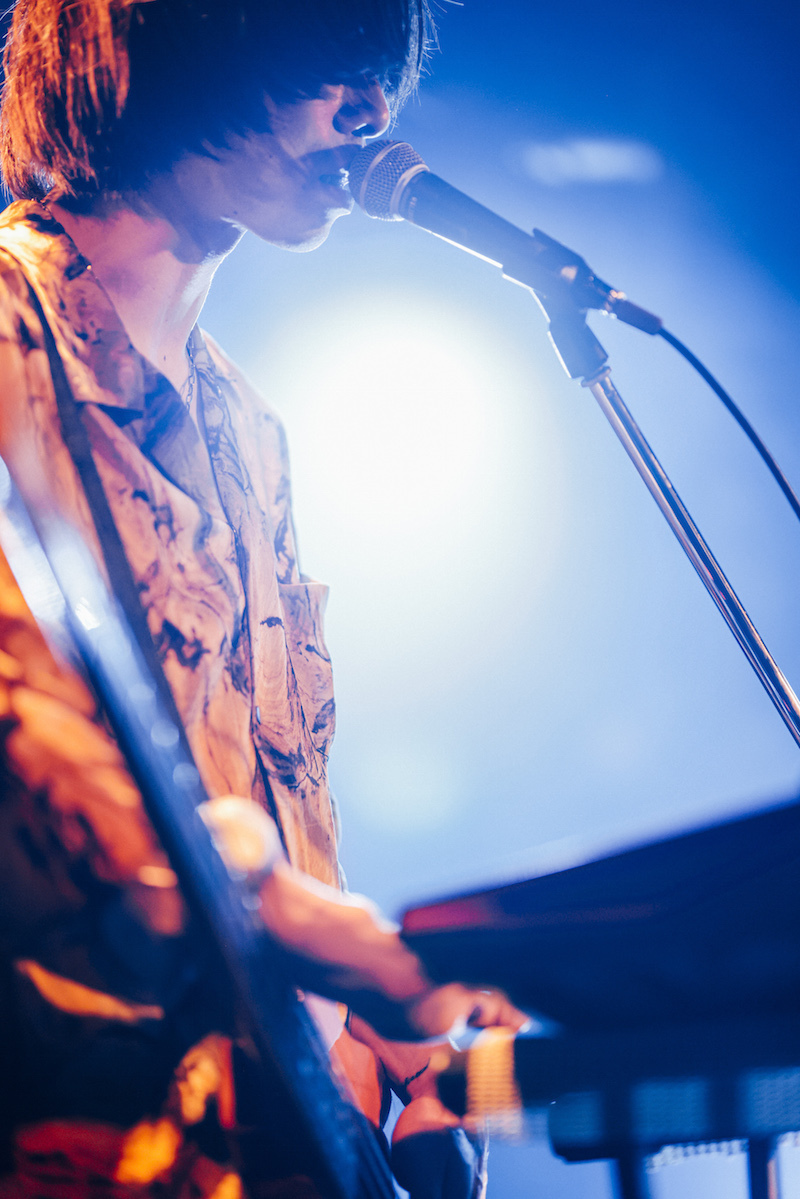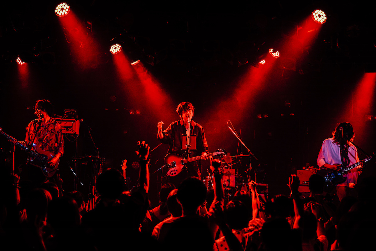 オープニングは「取捨選択」からの「火のない所の煙が僕さ」で、昨年9月リリースの7thアルバム『気配』と同じ曲順だ。カナタによる「取捨選択」の静かな唄い出し。徐々に加わる楽器の音。バンドが助走するなか、カナタがマイクから離れて何か叫ぶ。サンプリングパッドから鳴らされていたビートが生ドラムに変わる。満を持してサビに入った瞬間、一気に開ける視界。タナカとヤマモトもコーラスで加わり、3人で力強く唄うメロディ。<右手にはあなたの手/左手は何を掴んだ>〉。3分に満たない曲は高揚感を保ったまま終わっていく。その高揚感を逃さんとばかりに、カナタ、掲げたギターを下ろしたあと、「アーユーレディ、渋谷!?」とフロアを指した。