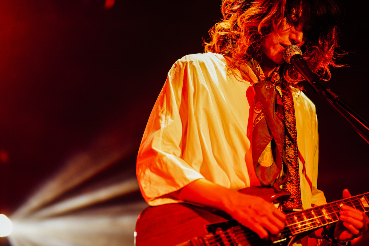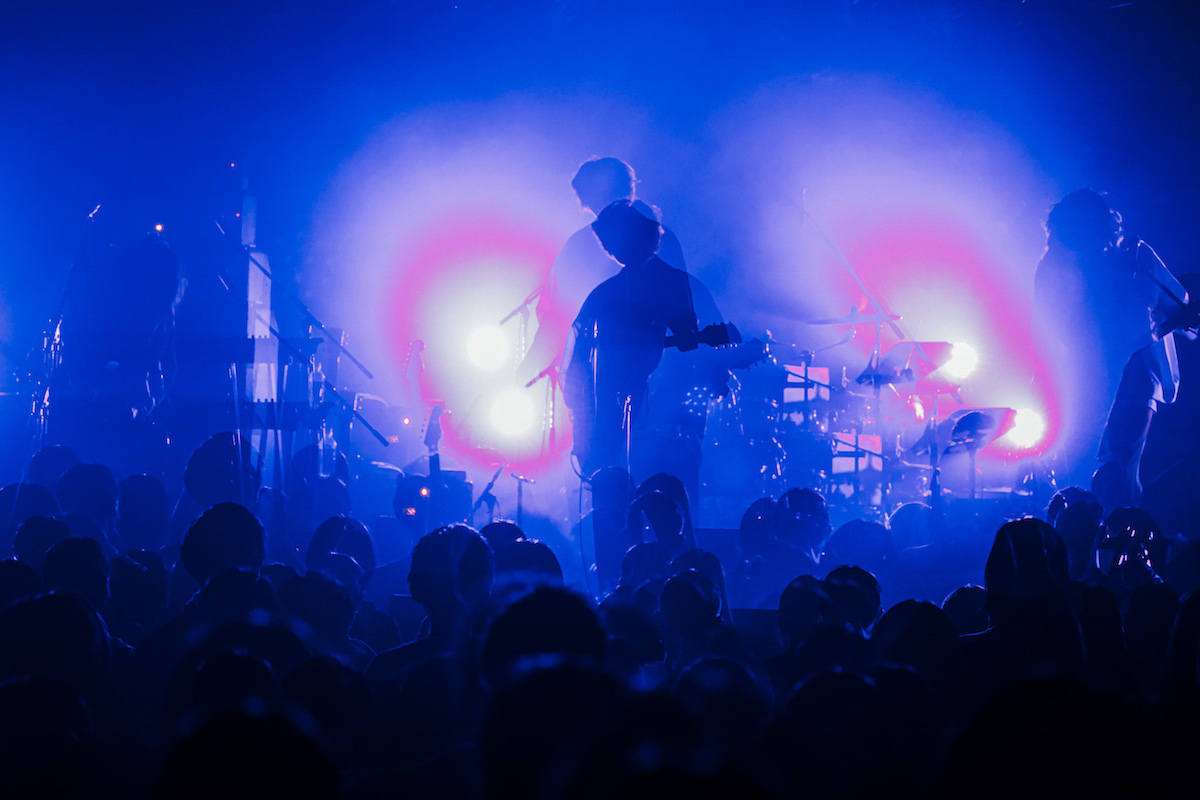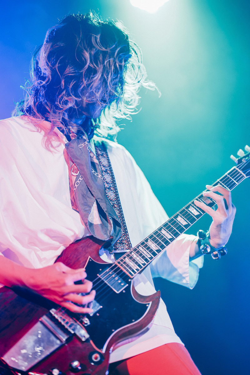 そのあと、タナカのカッティングから始まるのが「火のない所の煙が僕さ」。『気配』は打ち込みを取り入れたアルバムだったが、ライブで演奏するときは同期を必要最低限しか入れていない。生のサウンドによるダイナミズムも相まって、この2曲によるオープニングは、音源で聴く以上に華やかなものに。さらにそのサウンドからはバンドの調子の良さが漏れ出ているため、観客は盛り上がり手拍子だって起こる。赤い照明。揺れる床。これでもかと観客を煽るしぐさをするメンバー。因みに、観客が手拍子したり腕を上げたりするたびに鳴っている「シャラララ……」という音は、ツアーグッズの鈴付きリストバンドによるものだ。