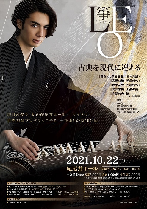 幅広い活動で注目を集める若き箏アーティストLEOが、2021年10月22日(金)に紀尾井ホールでリサイタルを行なう。作曲家 藤倉大に自ら委嘱した「箏協奏曲」は、この4月にサントリーホールで管弦楽版を初演しているが、今回は室内楽版として初披露。尺八の藤原道山との共演もあるなど、楽しみなプログラムが組まれている。LEOにリサイタルに向けた意気込みを聞いた。
