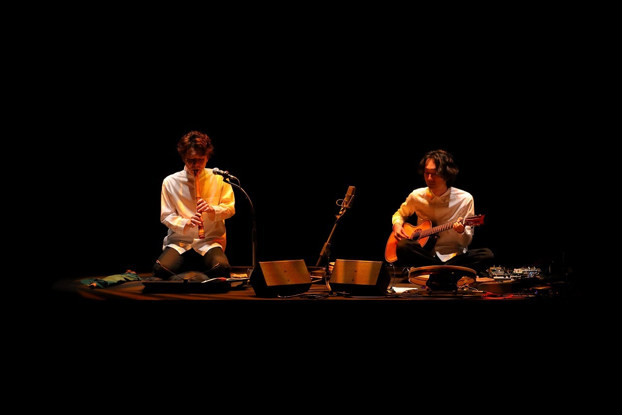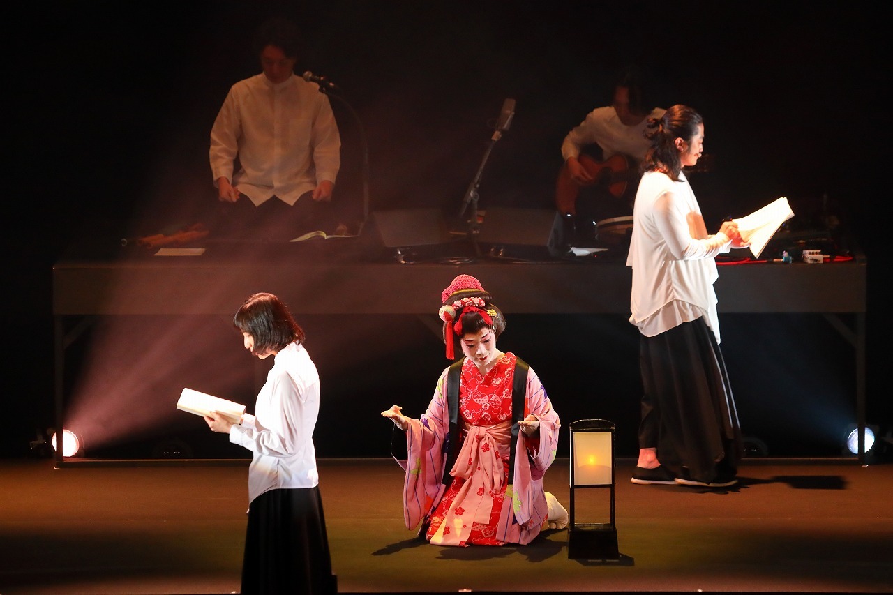 艶やかな振袖姿の花柳が膝をついてうなだれ、頭にはすっぽりと白い手拭いがかけられているという、ショッキングな姿から始まった本作。そのすぐ近くで朗読が始まり、声優が演じる奉行が、大空演じるお七に対し、火付け(放火)の罪を確かめている。舞台セットは、KOHKIと大河内が演奏するための台と、段がひとつだけあるシンプルなカタチで、演者はそこに立って朗読したり、段に座って朗読したりする。衣装もシンプルで声で物語を届けることを際立たせていることがわかる。